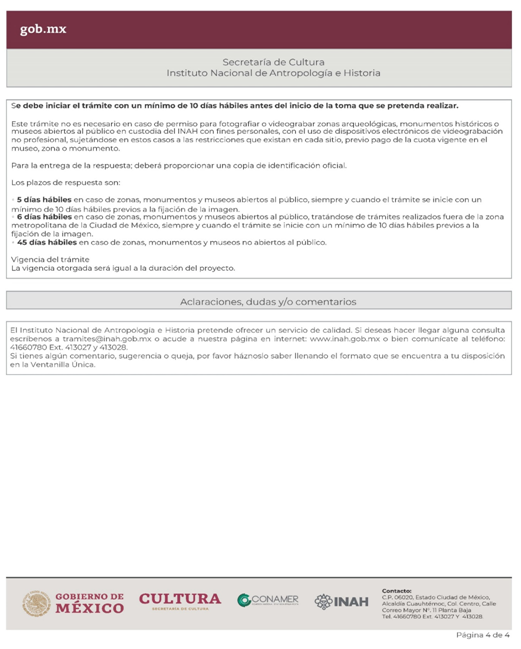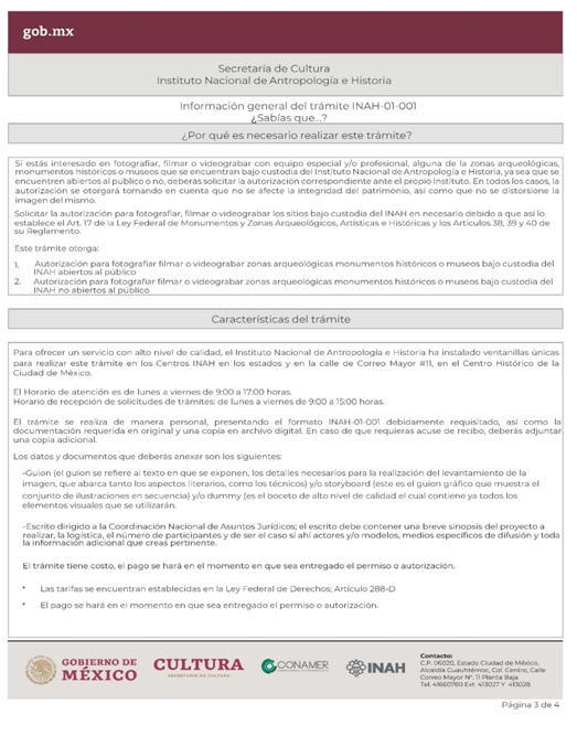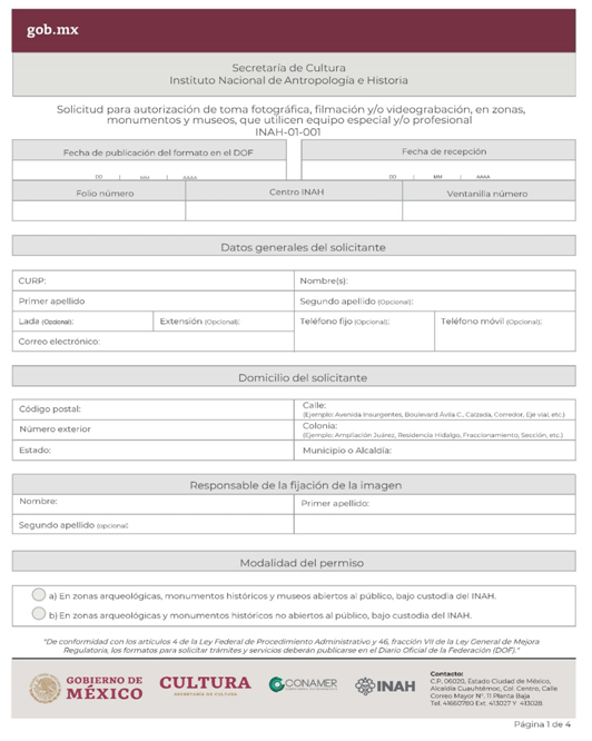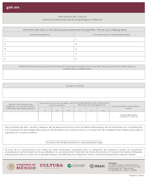 | INAH-01-001 | Autorización de toma fotográfica, filmación y/o videograbación, en zonas, monumentos y museos, que utilicen equipo especial y/o profesional. | Solicitud para la autorización de toma fotográfica, filmación y/o videograbación, en zonas, monumentos y museos, que utilicen equipo especial y/o profesional. |