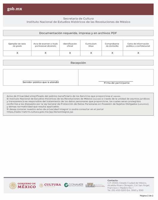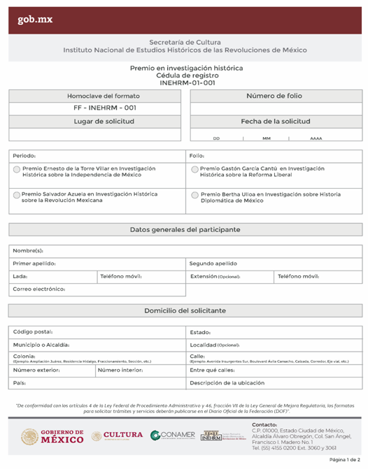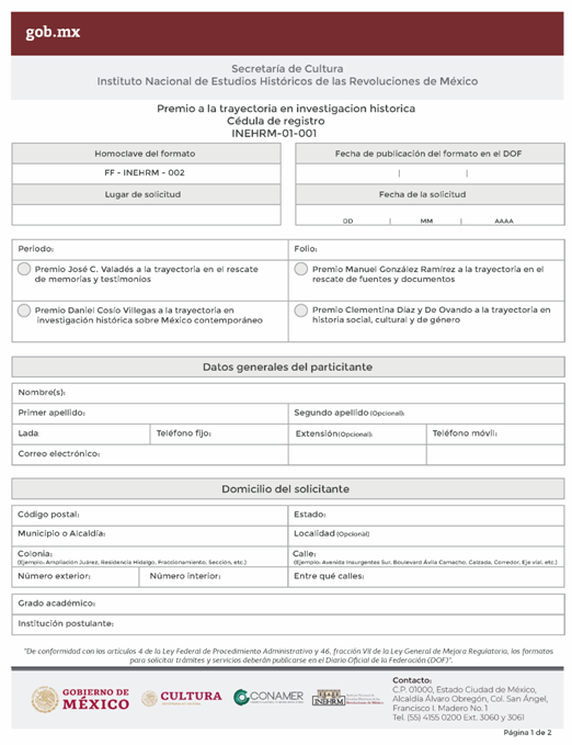 | INEHRM-01-001 | Participa en el certamen de Premios INEHRM bajo las modalidades de Trayectoria en Investigación Histórica e Investigación Histórica por mejor tesis de grado. | Premio en investigación histórica. |