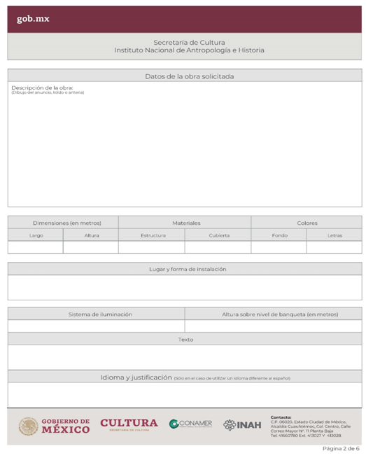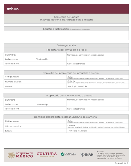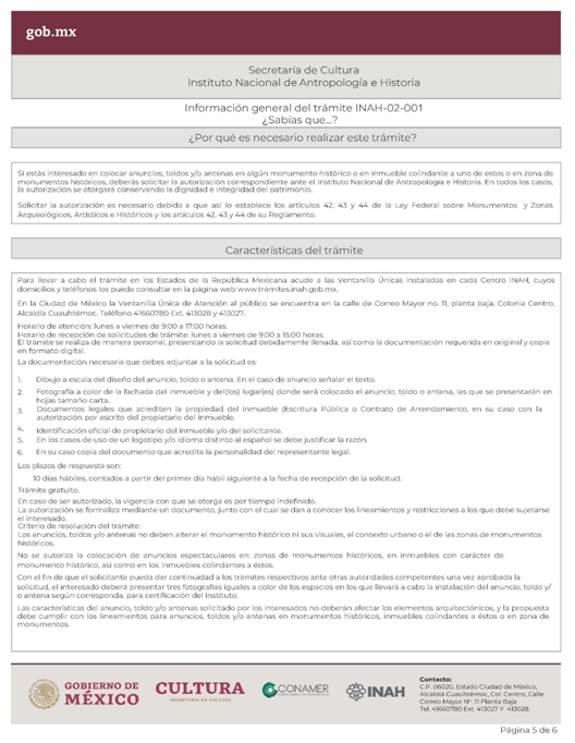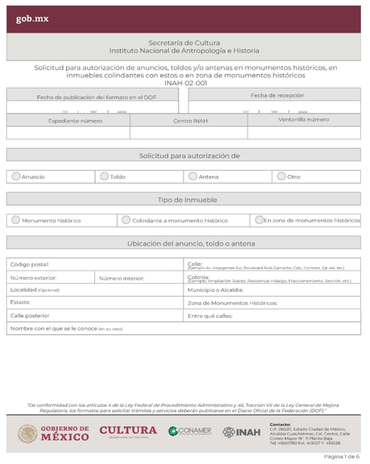 | INAH-02-001 | Autorización para colocar anuncios, toldos y/o antenas en monumentos históricos, en inmuebles colindantes con estos o en zona de monumentos históricos declaradas. | Solicitud para autorización de anuncios, toldos y/o antenas en monumentos históricos, en inmuebles colindantes con estos o en zona de monumentos históricos. |