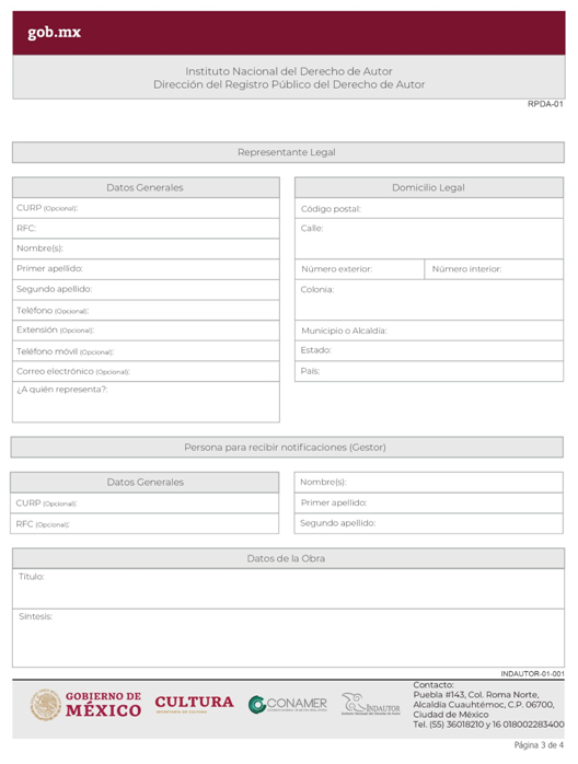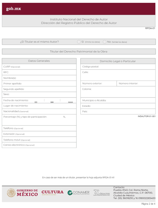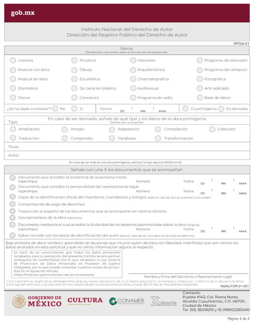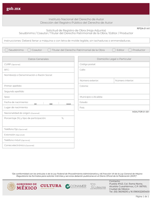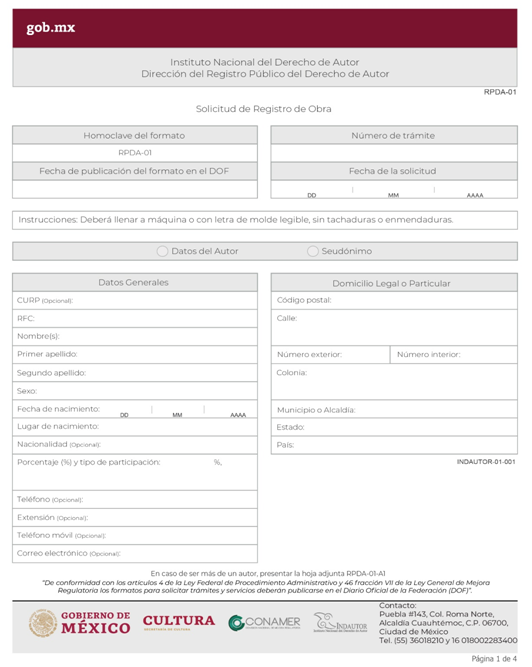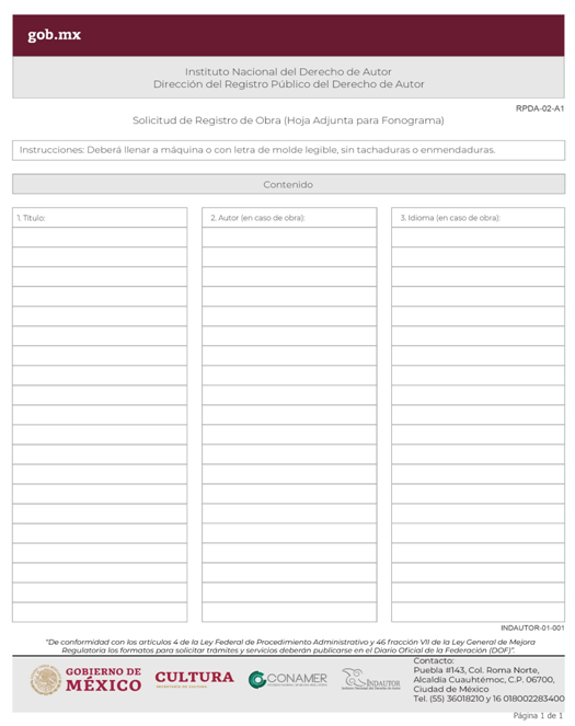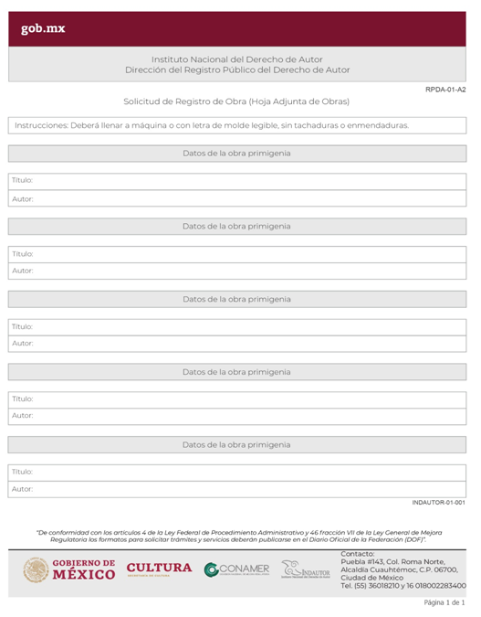 | INDAUTOR-01-001 | Registro de Obra Literaria o Artística. | RPDA-01 Solicitud de Registro de Obra. |