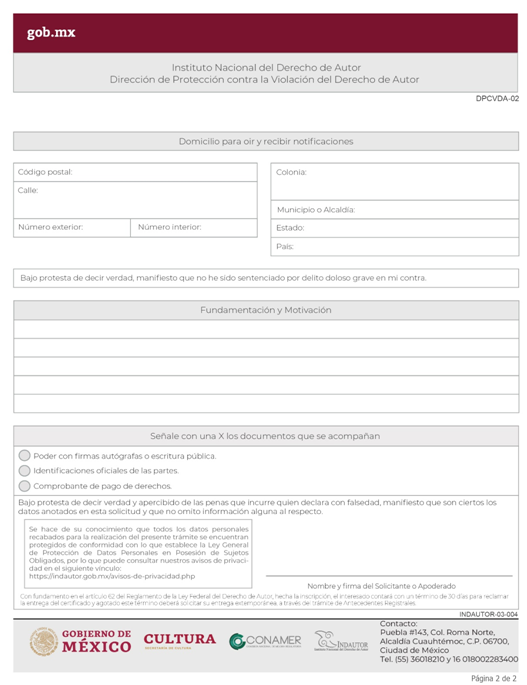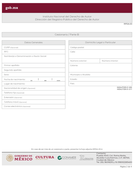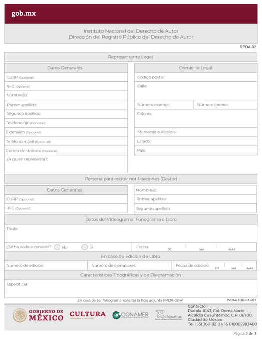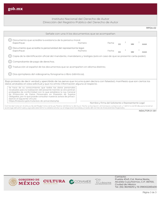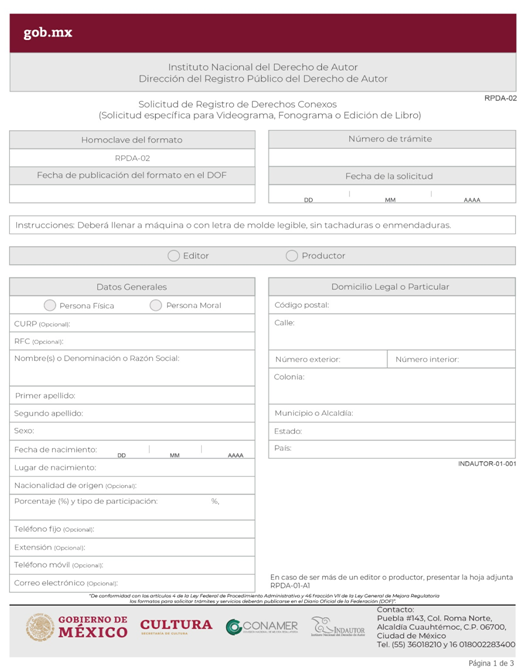 | RPDA-02 Solicitud de Registro de Derechos Conexos (Solicitud específica para Videograma, Fonograma o Edición de Libro). | ||