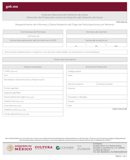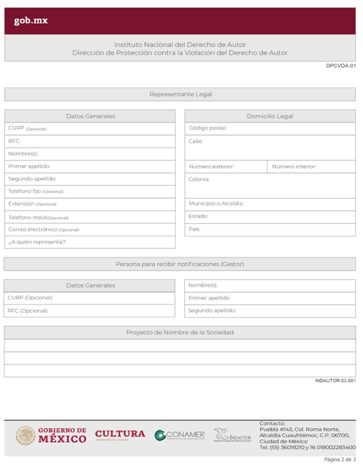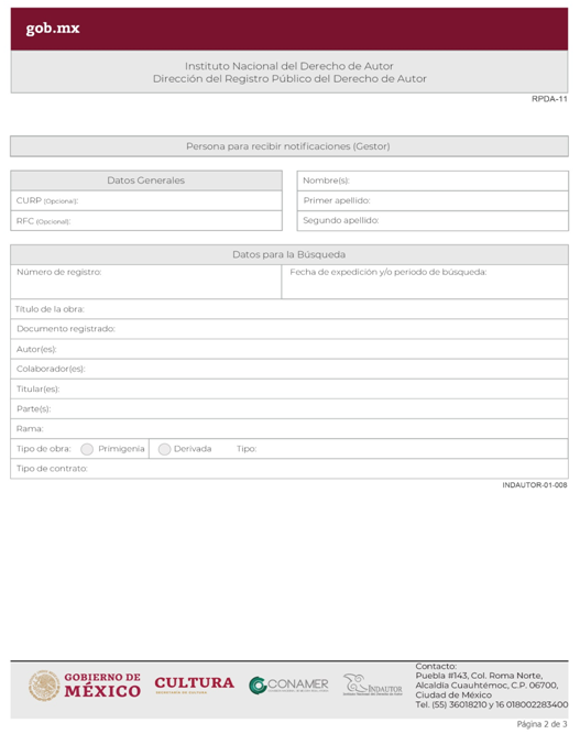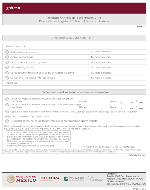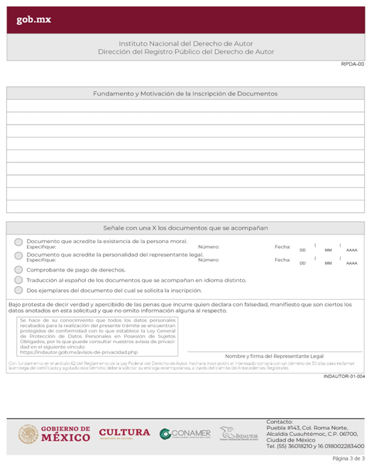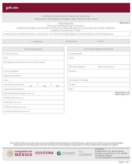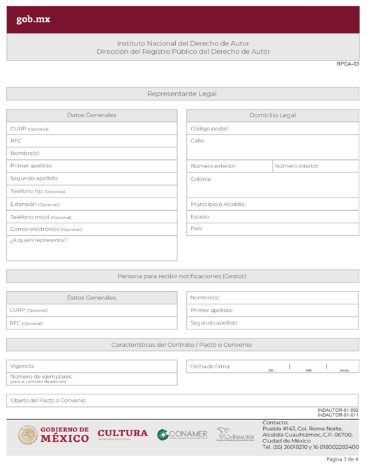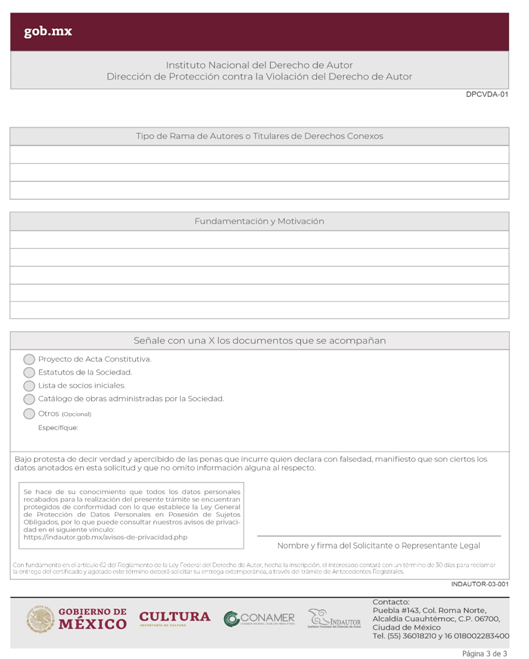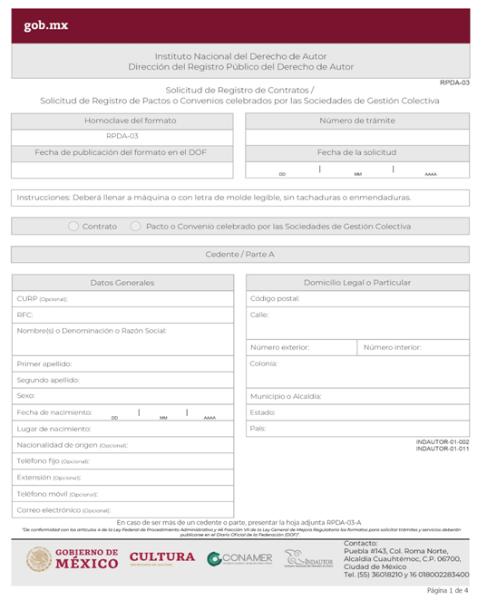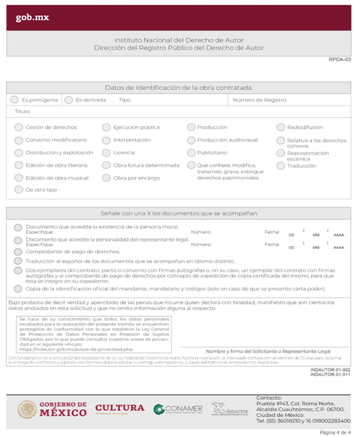 | INDAUTOR-01-002 | Registro de Contratos de Derechos de Autor. | RPDA-03 Solicitud de Registro de Contratos / Solicitud de Registro de Pactos o Convenios celebrados por las Sociedades de Gestión Colectiva. |