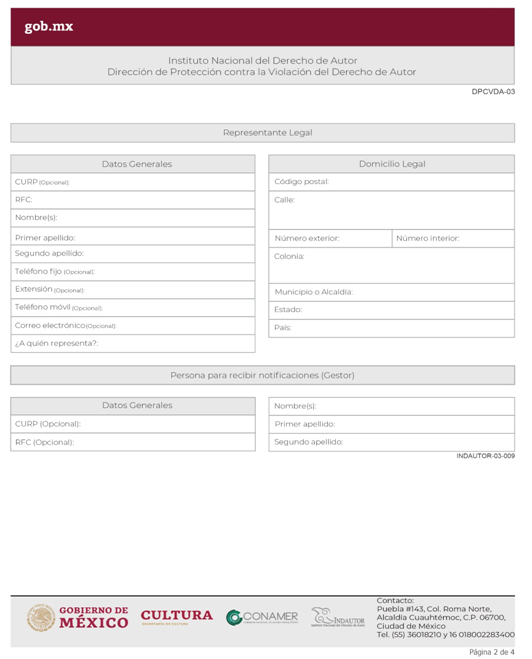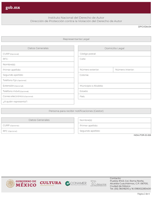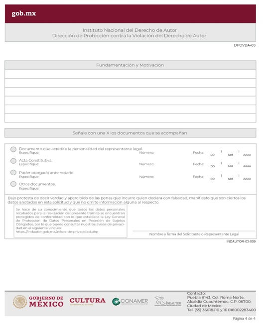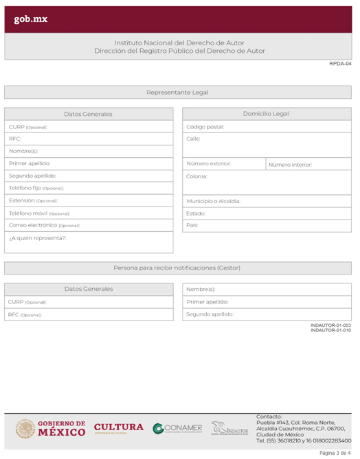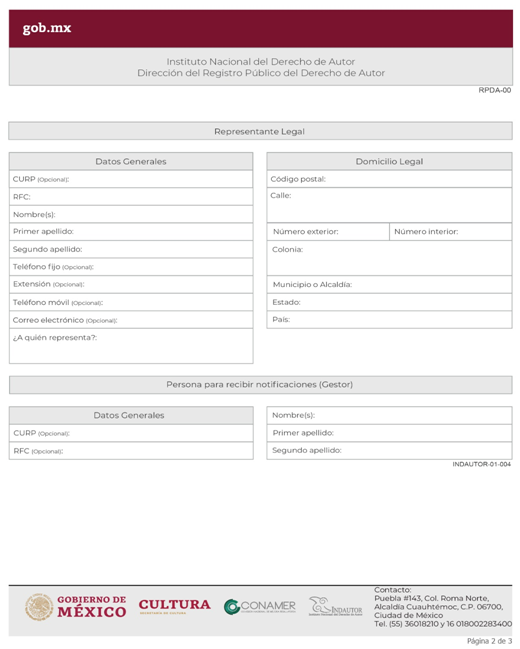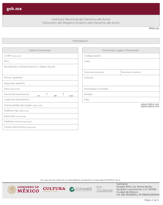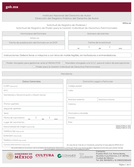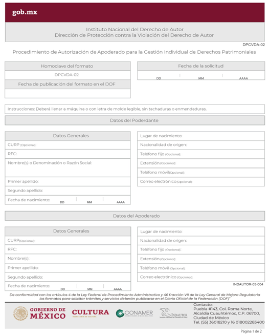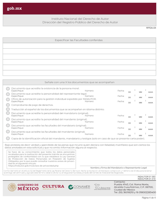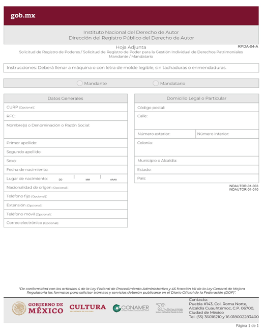 | INDAUTOR-01-003 | Registro de Poderes y Mandatos en Derecho de Autor. | RPDA-04 Solicitud de Registro de Poderes / Solicitud de Registro de Poder para la Gestión Individual de Derechos Patrimoniales. |