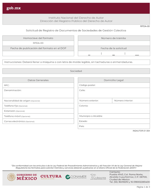| INDAUTOR-01-004 | Registro de documentos de Sociedades de Gestión Colectiva. | RPDA-00 Solicitud de Registro de Documentos de Sociedades de Gestión Colectiva. |