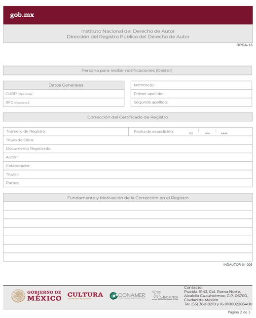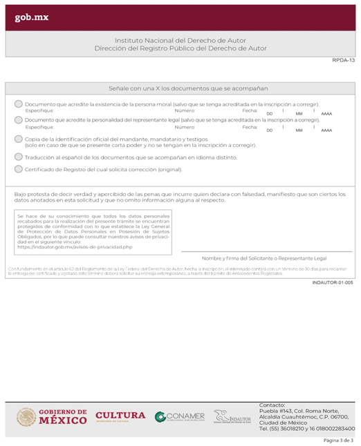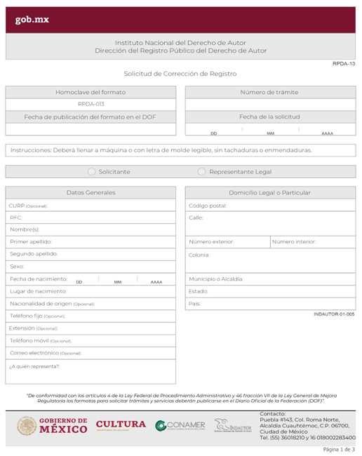 | INDAUTOR-01-005 | Solicitud de corrección de errores de transcripción o de otra índole directamente imputable al Registro Público del Derecho de Autor. | RPDA-13 Solicitud de Corrección de Registro. |