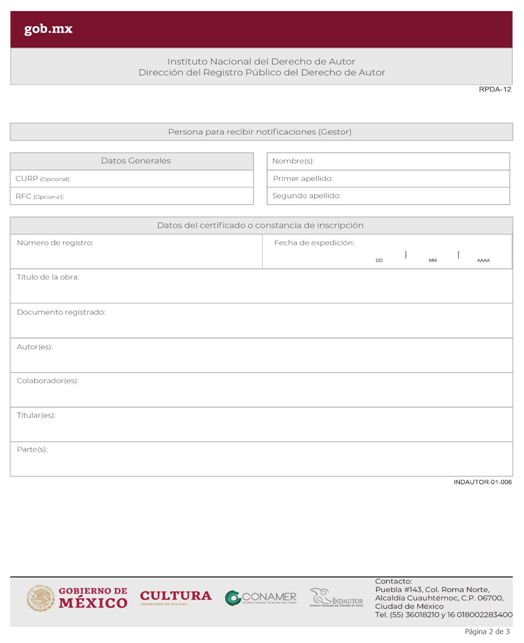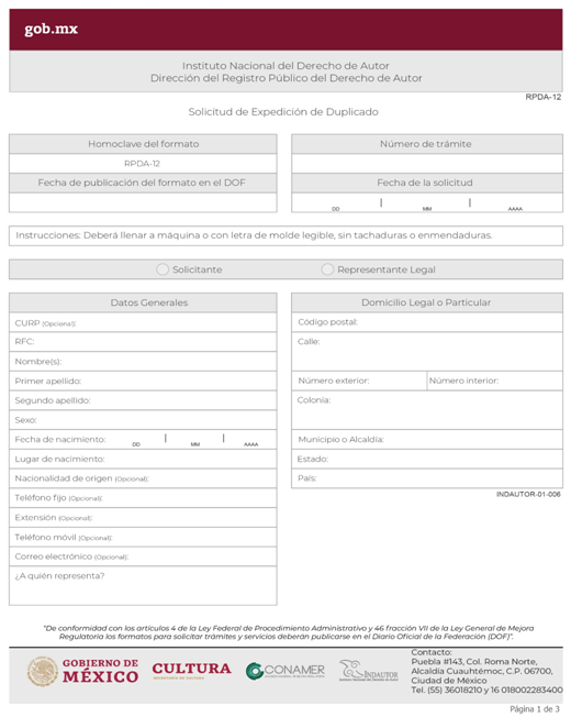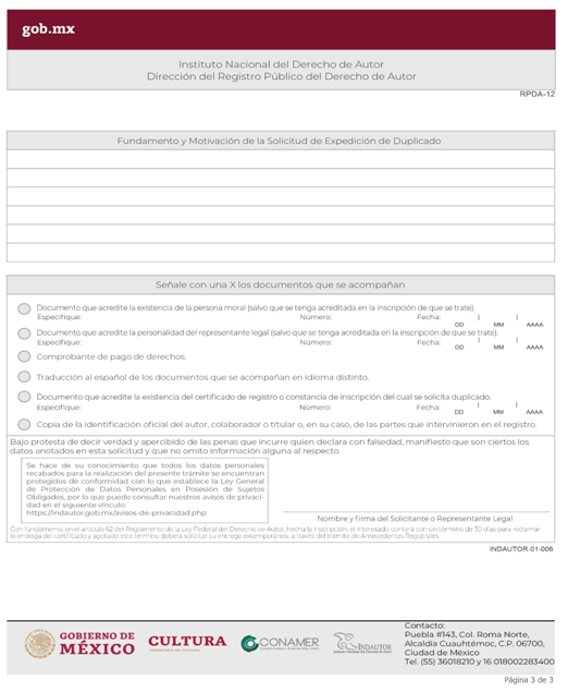 | INDAUTOR-01-006 | Solicitud de expedición de duplicado del certificado de inscripción o de la constancia de registro en el Registro Público del Derecho de Autor. | RPDA-12 Solicitud de Expedición de Duplicado. |