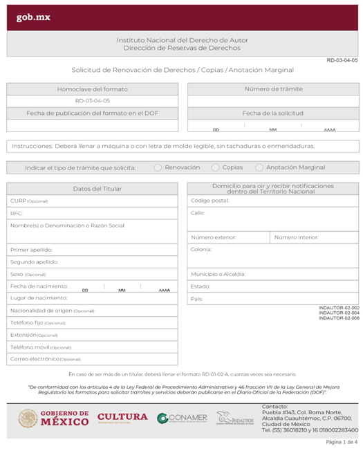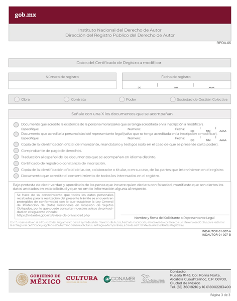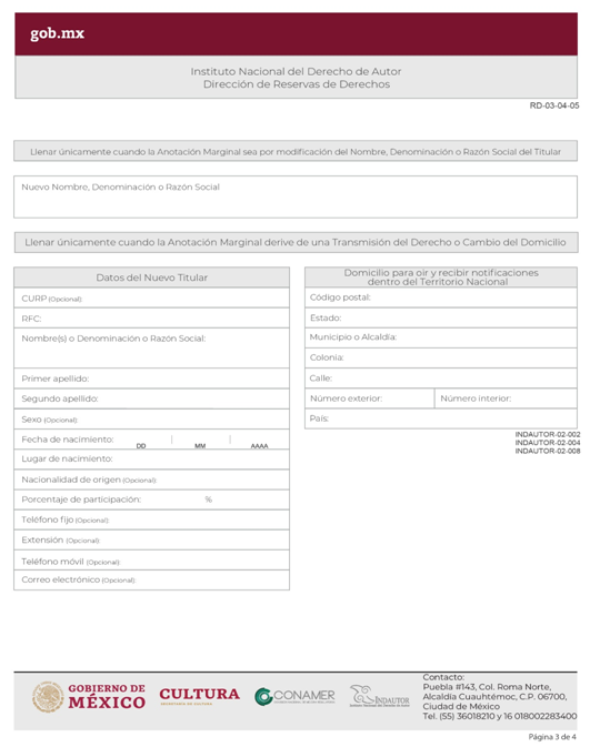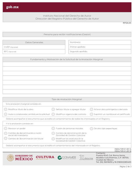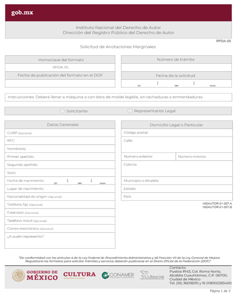 | INDAUTOR-01-007-A | Solicitud de Anotación Marginal en el Registro Público del Derecho de Autor. Modalidad A: Anotación marginal para modificar el título de la obra; hacer mención de autor o colaborador omitido en la solicitud; señalar o agregar titular de derechos patrimoniales; modificar vigencia del contrato; cambio de denominación o razón social del titular; cambio de denominación o razón social del mandante; cambio de denominación de la Sociedad de Gestión Colectiva; aclarar si la obra es primigenia o derivada; fusión de personas morales; modificación de los estatutos de la Sociedad de Gestión Colectiva; suprimir un nombre en el certificado. | RPDA-05 Solicitud de Anotaciones Marginales. |