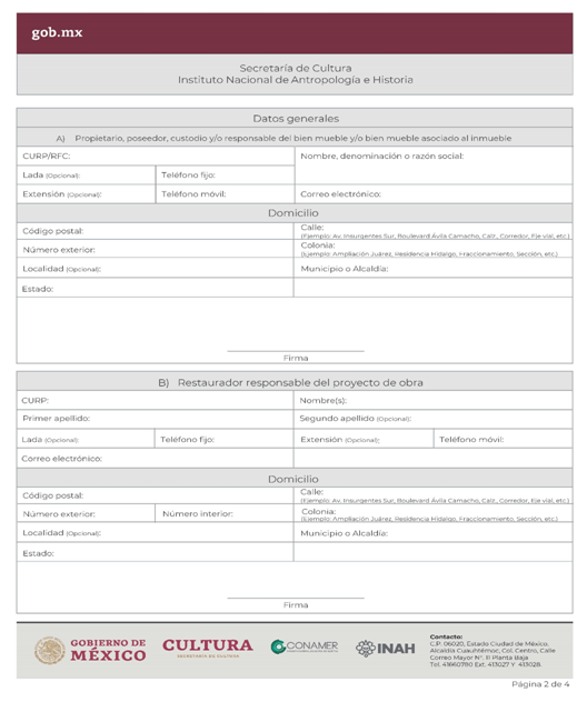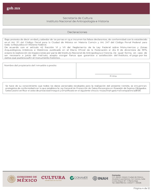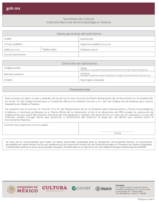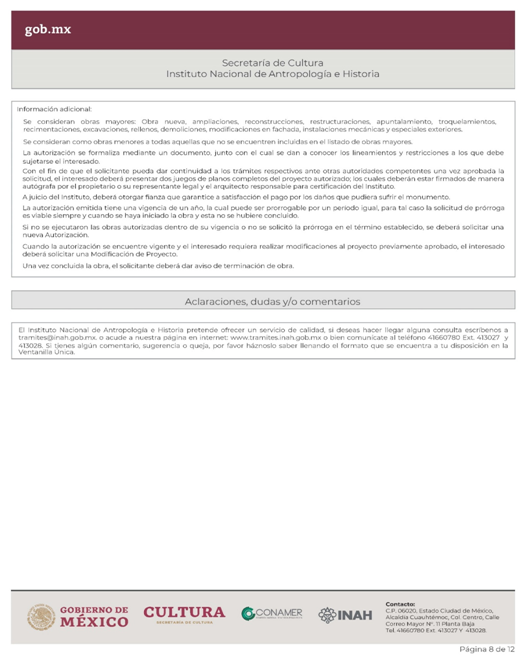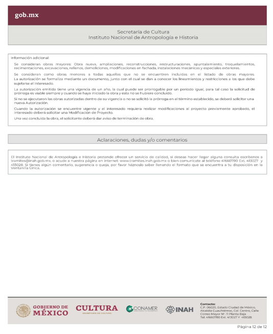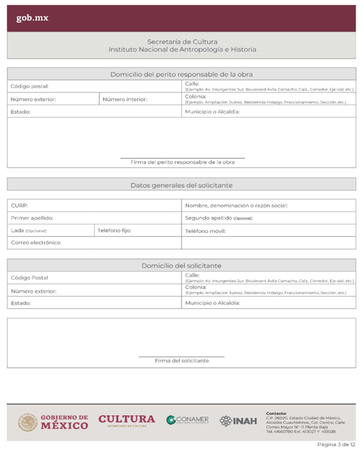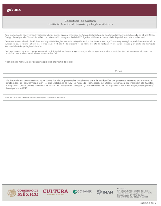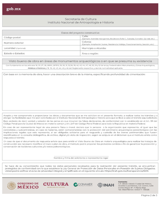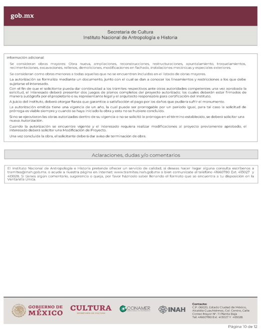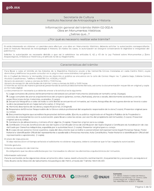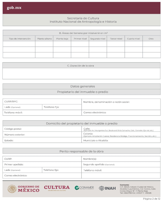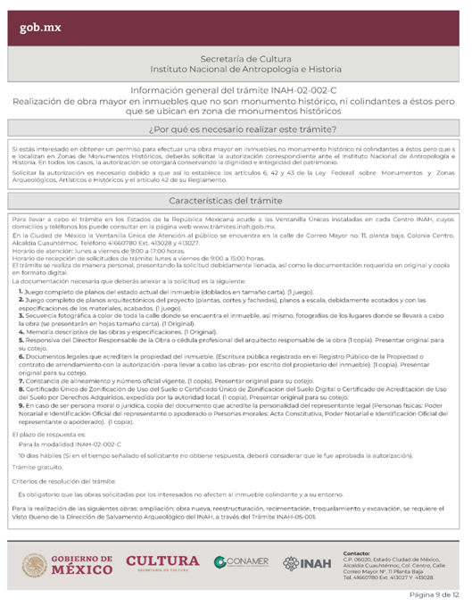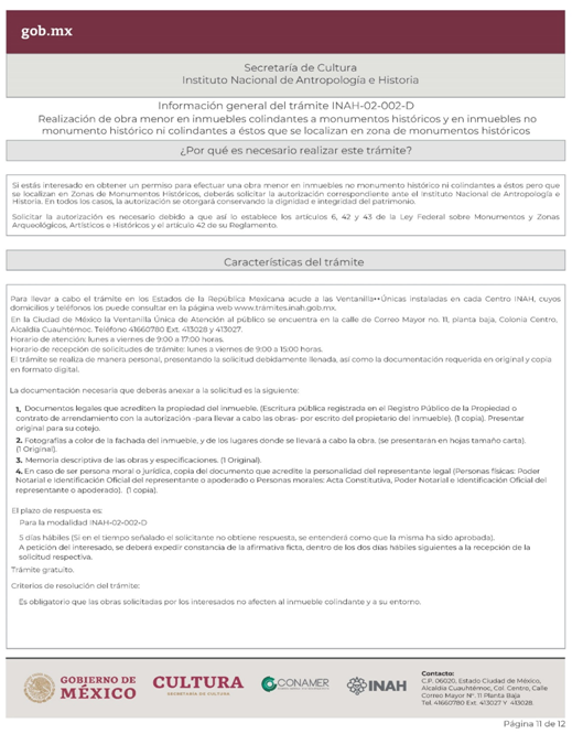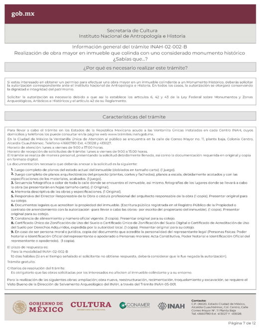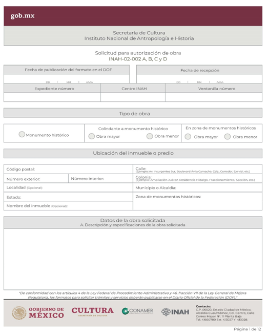 | INAH-02-002- (A, B, C y D) | Permiso de obra en monumentos históricos, en inmuebles colindantes a un monumento histórico, y en inmuebles que no son monumento histórico ni colindantes a éstos, pero están localizados en zonas de monumentos históricos. Modalidad A: Obra en Monumentos Históricos. Modalidad B: Realización de obra mayor en un inmueble que colinda con uno considerado Monumento Histórico. Modalidad C: Realización de obra mayor en inmuebles que no son monumentos históricos, ni colindantes a éstos, pero que se ubican en zona de Monumentos Históricos. Modalidad D: Realizaciones de obra menor en inmuebles colindantes a Monumentos Históricos y en inmuebles no Monumentos Históricos ni colindantes a éstos que se localizan en Zona de Monumentos Históricos. | Solicitud para autorización de obra. |