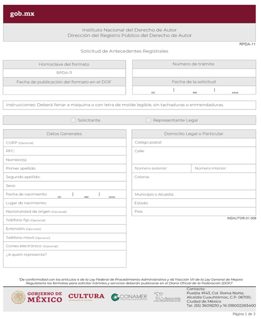 | INDAUTOR-01-008 | Solicitud de Antecedentes Registrales en el Registro Público del Derecho de Autor. | RPDA-11 Solicitud de Antecedentes Registrales. |