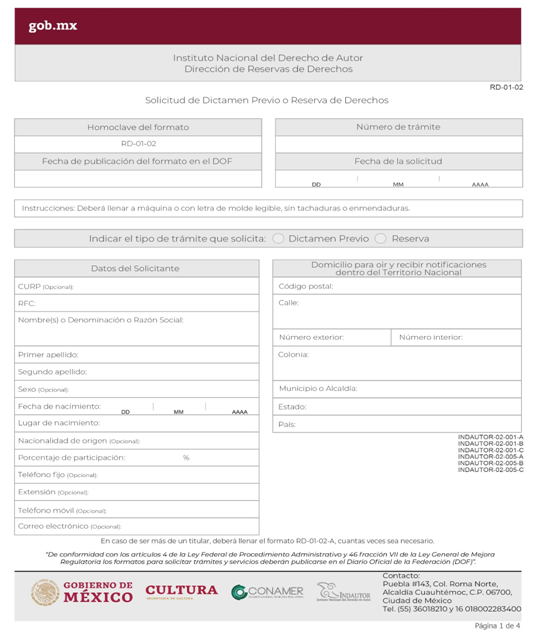 | INDAUTOR-02-001-C | Solicitud de Reserva de Derechos al uso Exclusivo. Modalidad C: Publicaciones y Difusiones Periódicas. | RD-01-02 Solicitud de Dictamen Previo o Reserva de Derechos. |