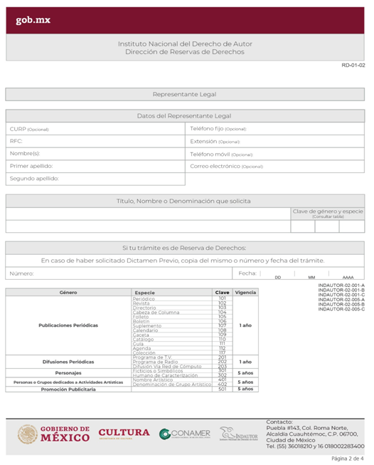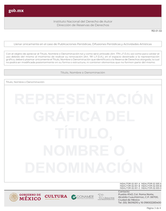 | INDAUTOR-02-001-A | Solicitud de Reserva de Derechos al Uso exclusivo. Modalidad A: Personajes Ficticios o Simbólicos, o Humanos de Caracterización, Nombres Artísticos o Denominaciones de Grupos Artísticos. | RD-01-02 Solicitud de Dictamen Previo o Reserva de Derechos. |