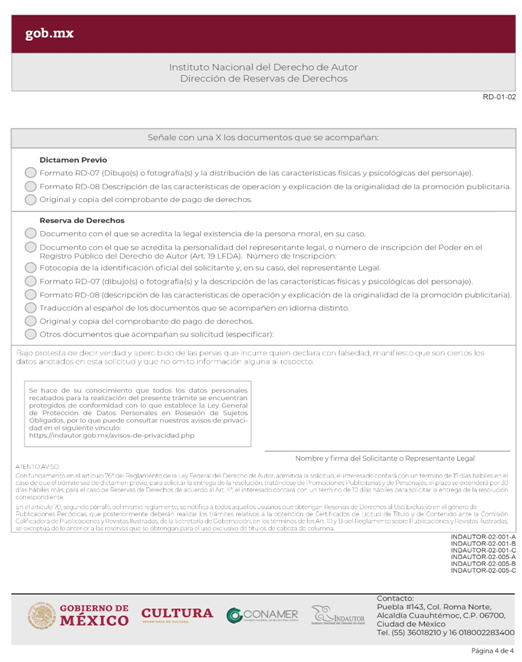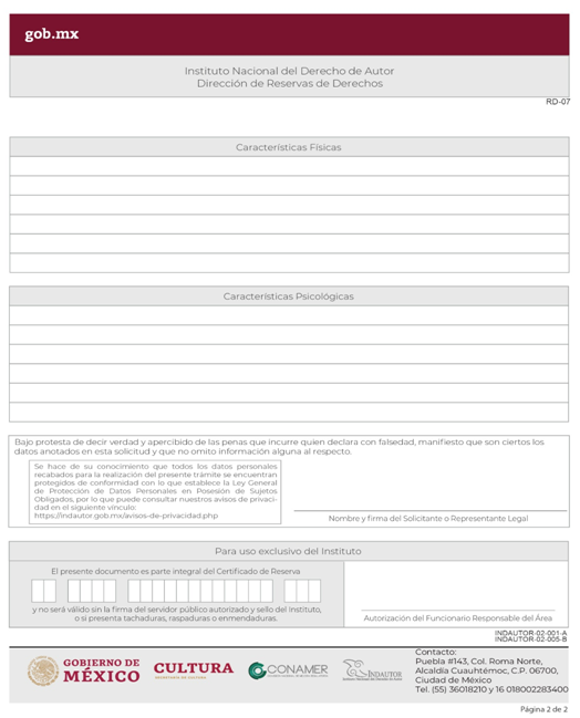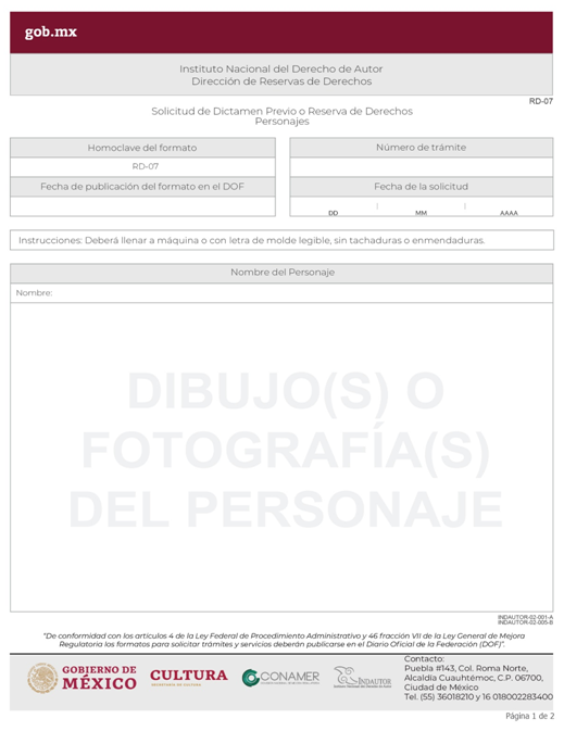 | RD-07 Solicitud de Dictamen Previo o Reserva de Derechos Personajes. |