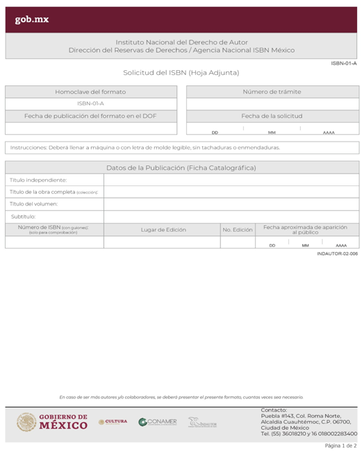 | ISBN-01-A Solicitud del ISBN (Hoja Adjunta). | ||