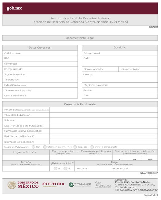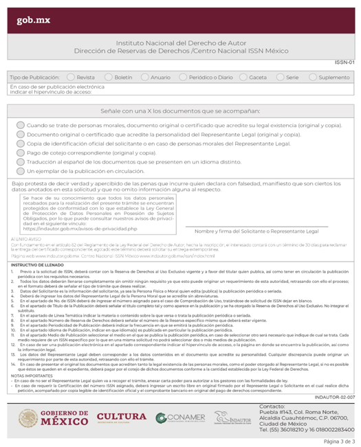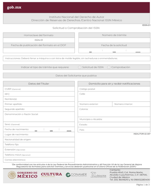 | INDAUTOR-02-007 | Obtención del Número Internacional Normalizado para publicaciones periódicas (ISSN). | ISSN-01 Solicitud o Comprobación del ISSN. |