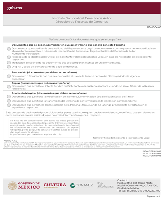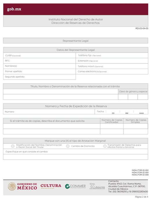 | INDAUTOR-02-004 | Solicitud de anotación marginal en los expedientes de Reservas de Derechos. | RD-01-02-A Solicitud de Dictamen Previo o Reserva de Derechos (Hoja Adjunta). |