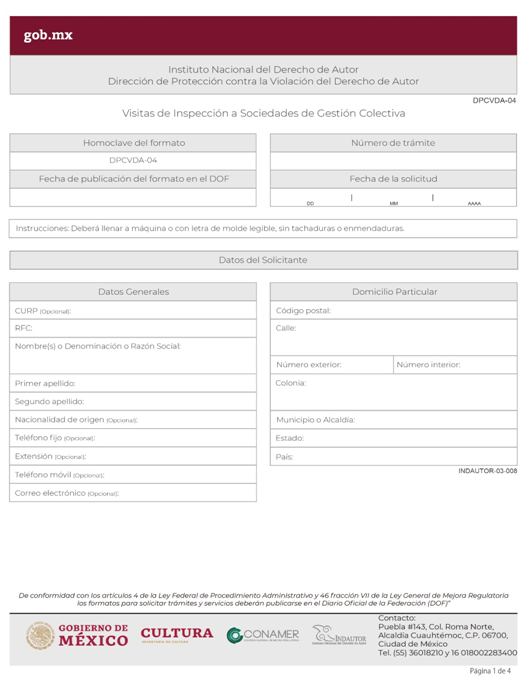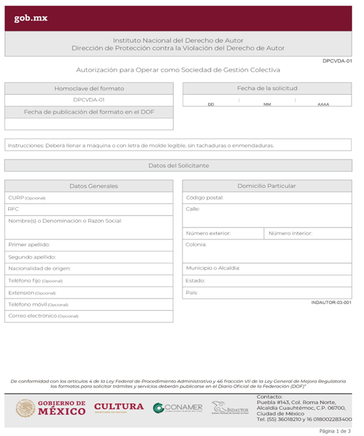 | INDAUTOR-03-001 | Solicitud de autorización para operar como Sociedad de Gestión Colectiva. | DPCVDA-01 Autorización para Operar como Sociedad de Gestión Colectiva. |