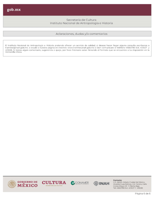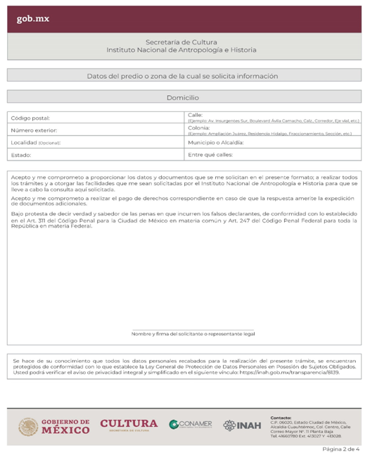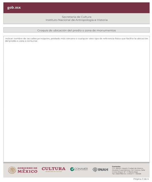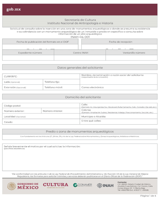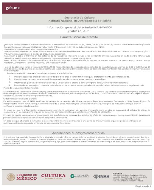 | INAH-04-001 | Solicitud de consulta sobre la inserción en una zona de monumentos arqueológicos o donde se presuma su existencia o su colindancia con un monumento arqueológico de un inmueble o predio en específico o consulta sobre información de un sitio arqueológico. | Solicitud de consulta sobre la inserción en una zona de monumentos arqueológicos o donde se presuma su existencia o su colindancia con un monumento arqueológico de un inmueble o predio en específico o consulta sobre información de un sitio arqueológico. |