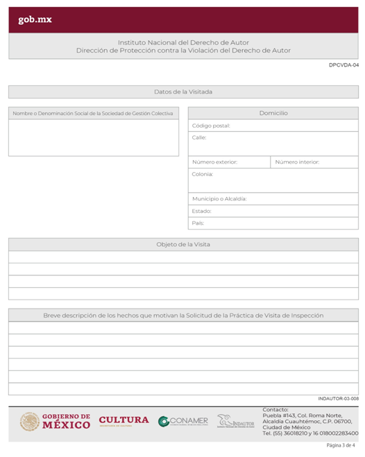 | INDAUTOR-03-008 | Visitas de Inspección a Sociedades de Gestión Colectiva. | DPCVDA-04 Visitas de Inspección a Sociedades de Gestión Colectiva. |