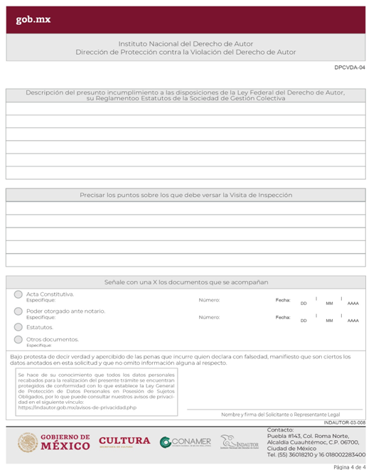 | INDAUTOR-01-010 | Registro de poder para la gestión individual de derechos patrimoniales. | RPDA-04 Solicitud de Registro de Poderes / Solicitud de Registro de Poder para la Gestión Individual de Derechos Patrimoniales. |