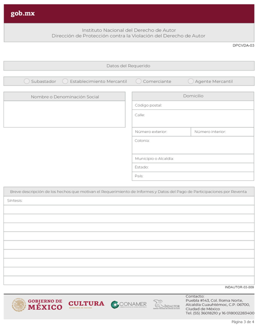 | INDAUTOR-03-009 | Requerimiento de informes y datos respecto del pago de participaciones por reventa. | DPCVDA-03 Requerimiento de Informes y Datos Respecto del Pago de Participaciones por Reventa. |