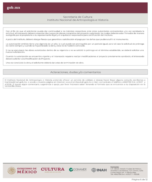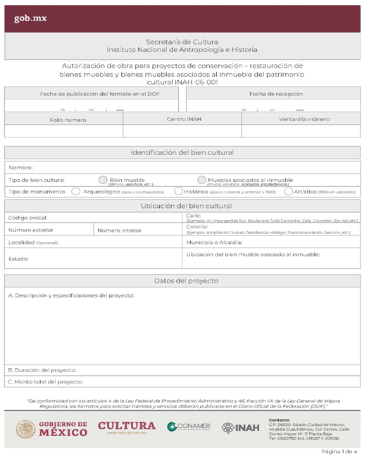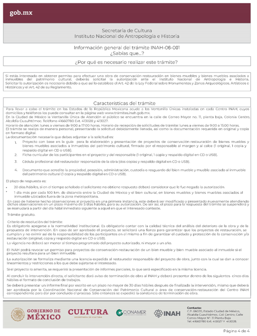 | INAH-06-001 | Autorización de obra para proyectos de conservación-restauración de bienes muebles y bienes muebles asociados al inmueble del patrimonio cultural. | Autorización de obra para proyectos de conservación-restauración de bienes muebles y bienes muebles asociados al inmueble del patrimonio cultural. |