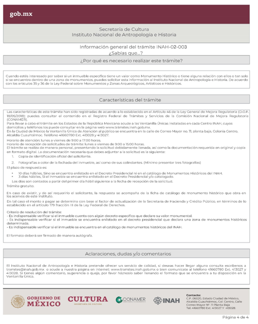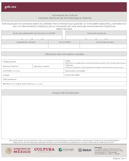 | INAH-02-003 | Consulta sobre la calidad monumental que guarda un inmueble específico, colindancia con un Monumento Histórico y/o su inclusión en una zona de monumentos históricos. | Solicitud para la consulta sobre la calidad monumental que guarda un inmueble específico, colindancia con un Monumento Histórico y/o su inclusión en una zona de monumentos históricos. |