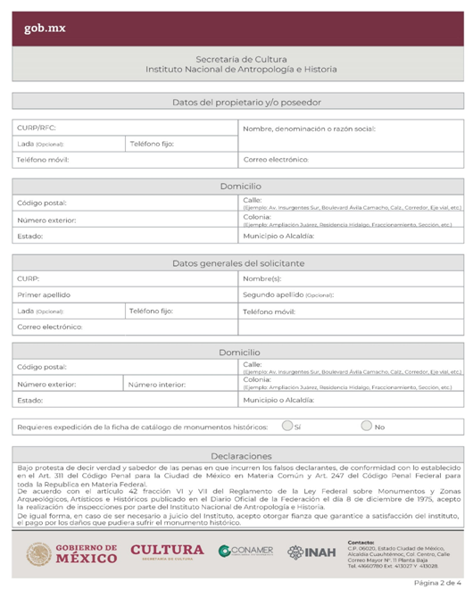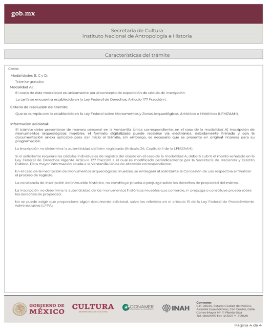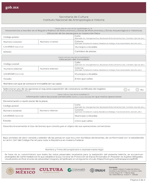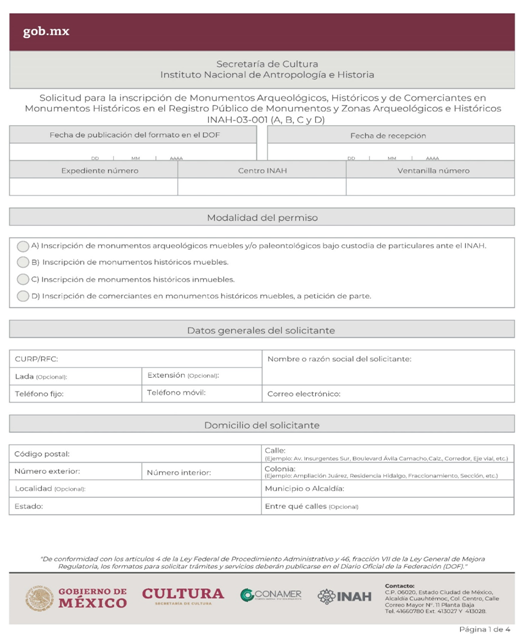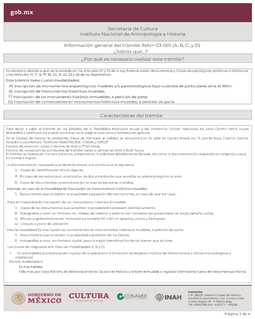 | INAH-03-001- (A, B, C y D) | Solicitud para la inscripción de Monumentos Arqueológicos, Históricos y de Comerciantes en Monumentos Históricos en el Registro Público de Monumentos y Zonas Arqueológicos e Históricos. Modalidad A: Inscripción de monumentos arqueológicos muebles y/o paleontológicos bajo custodia de particulares ante el INAH. Modalidad B: Inscripción de monumentos históricos muebles. Modalidad C: Inscripción de un monumento histórico inmueble, a petición de parte. Modalidad D: Inscripción de comerciantes en monumentos históricos muebles, a petición de parte. | Solicitud para la inscripción de Monumentos Arqueológicos, Históricos y de Comerciantes en Monumentos Históricos en el Registro Público de Monumentos y Zonas Arqueológicos e Históricos. |