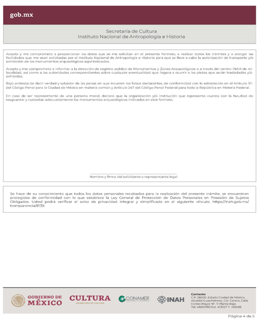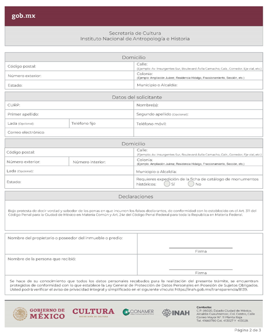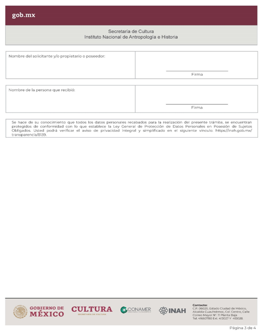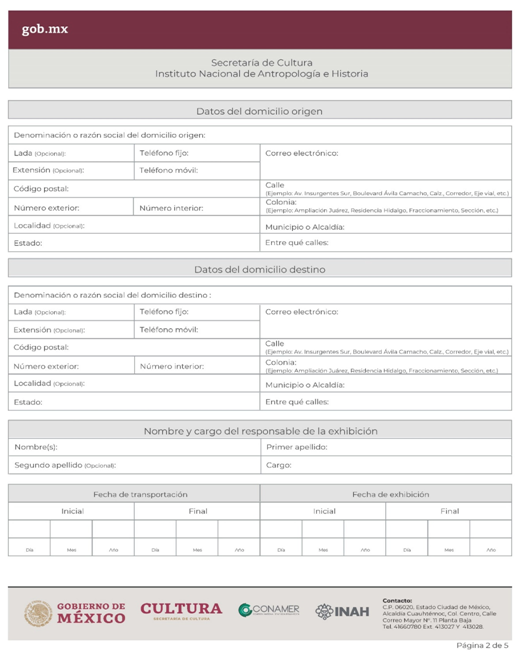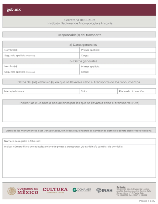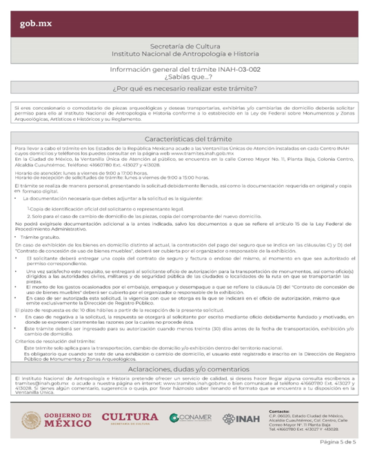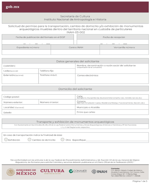 | INAH-03-002 | Solicitud de permiso para la transportación, cambio de domicilio y/o exhibición de monumentos arqueológicos muebles dentro del territorio nacional en custodia de particulares. | Solicitud de permiso para la transportación, cambio de domicilio y/o exhibición de monumentos arqueológicos muebles dentro del territorio nacional en custodia de particulares. |