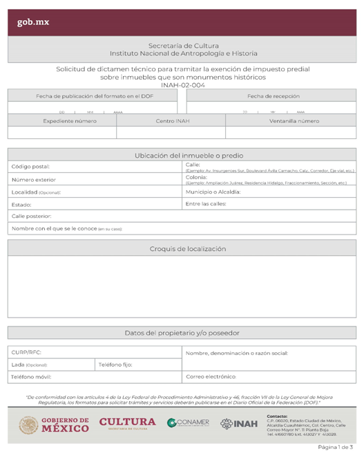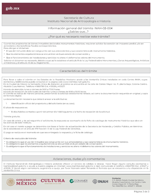 | INAH-02-004 | Solicitud de dictamen técnico para tramitar la exención de impuesto predial sobre inmuebles que son monumentos históricos. | Solicitud de dictamen técnico para tramitar la exención de impuesto predial sobre inmuebles que son monumentos históricos. |