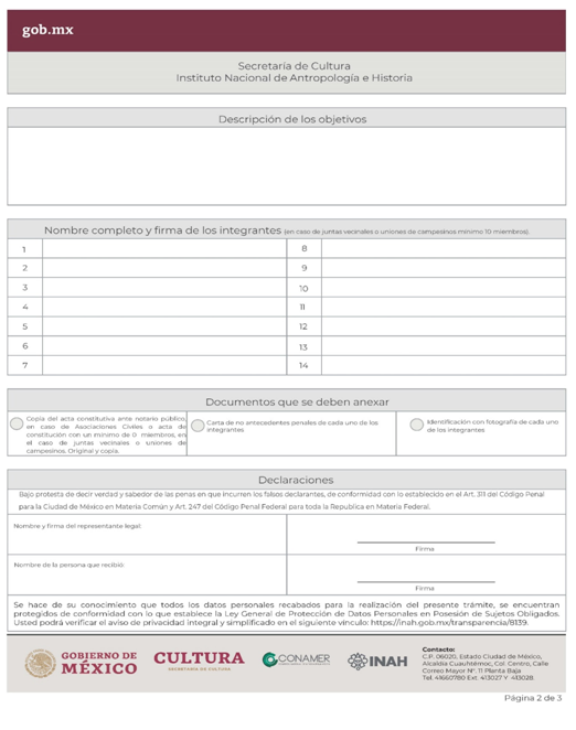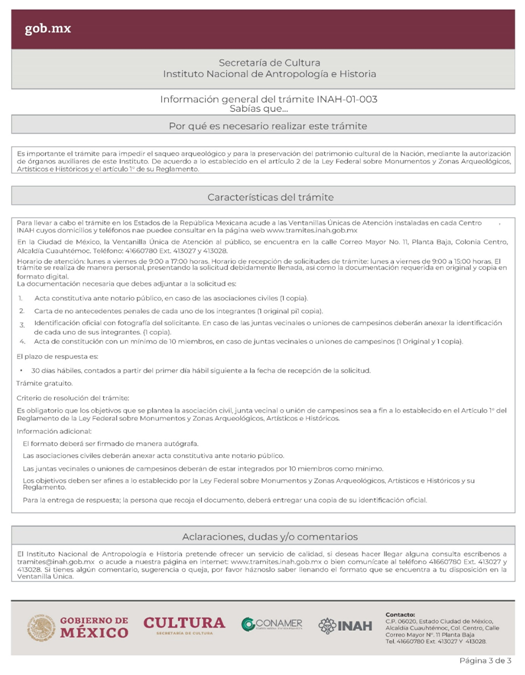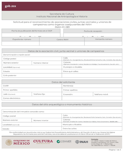 | INAH-01-003 | Solicitud para el reconocimiento de asociaciones civiles, juntas vecinales y uniones de campesinos, como órganos coadyuvantes del INAH. | Solicitud para el reconocimiento de asociaciones civiles, juntas vecinales y uniones de campesinos como órganos coadyuvantes del INAH. |