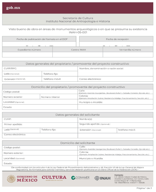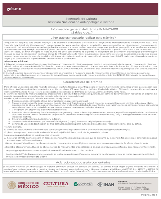 | INAH-05-001 | Visto bueno de obra en áreas de monumentos arqueológicos o en que se presuma su existencia. | Visto bueno de obra en áreas de monumentos arqueológicos o en que se presuma su existencia. |