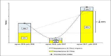 b. Las importaciones investigadas se incrementaron en términos absolutos y relativos. Durante el periodo analizado registraron un crecimiento de 220% (disminuyeron 73% en el periodo agosto de 2016-julio de 2017, pero aumentaron 1,100% en el periodo investigado) y aumentaron su