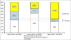 participación en el CNA en 26 puntos porcentuales, al pasar de una contribución de 29% en el periodo agosto de 2015-julio de 2016 a 55% en el periodo investigado. En relación con la producción nacional aumentaron su participación en 84 puntos porcentuales en el periodo analizado, al pasar de una contribución de 60% en el periodo agosto de 2015-julio de 2016 a 144% en el periodo investigado.