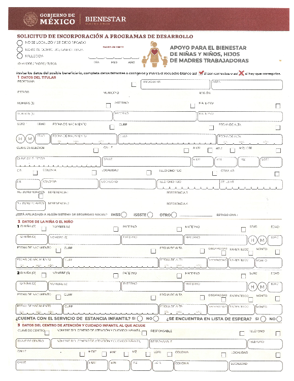 | 1. Que la madre, padre solo o tutor esté trabajando, buscando empleo o estudiando. 2. No contar con el servicio de cuidado y atención infantil, a través de instituciones públicas de seguridad social u otros medios | 1. Identificación oficial vigente en original. (En caso de ser menor de edad presentar pasaporte o acta de nacimiento) o carta de identidad emitida por el Municipio; 2. CURP (Clave Única de Registro de Población) de la madre, padre solo o tutor en original. | |