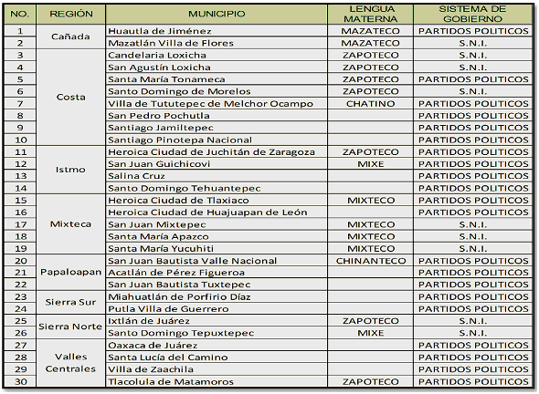 30 Municipios del Estado de Oaxaca, a saber: