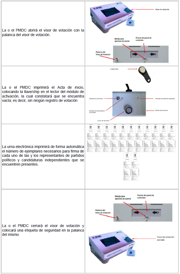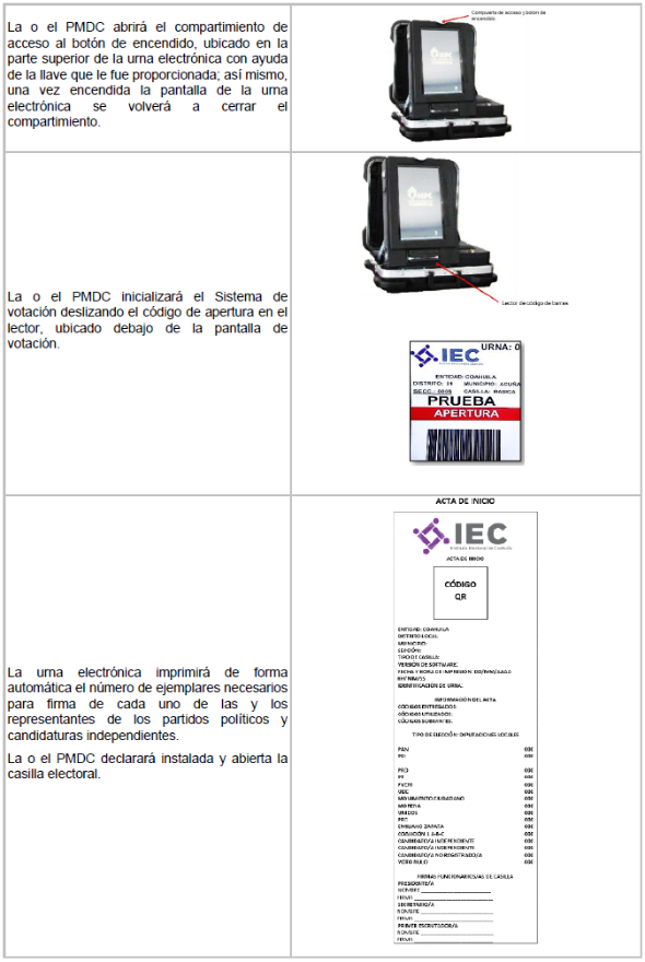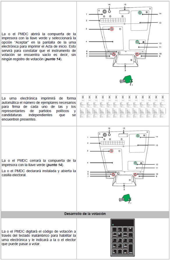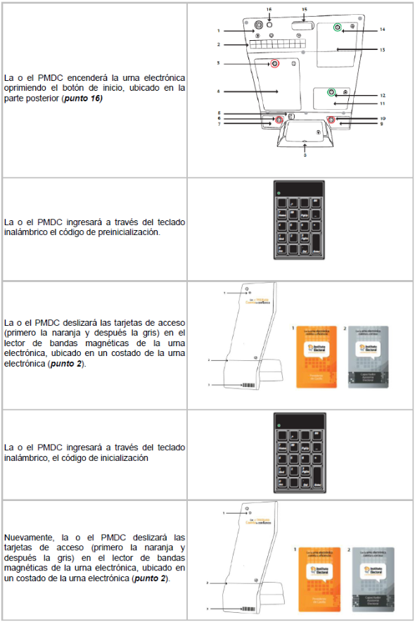 | 8. La o el pmdc encenderá la urna electrónica presionando el botón de encendido. 9. La o el pmdc cerrará el compartimiento de acceso al botón de encendido con ayuda de la llave. 10. La o el pmdc inicializará el Sistema de votación deslizando en el lector, ubicado debajo de la pantalla de votación, el código de apertura. Con esta acción la urna electrónica imprimirá de forma automática el Acta de inicio, la cual constatará que se encuentra vacía, es decir, que se encuentra sin ningún registro de votación. 11. La urna electrónica imprimirá de forma automática el número de ejemplares necesarios para firma de cada uno de las y los representantes de Partidos políticos y candidaturas independientes. 12. La o el pmdc, con el auxilio de la o el Secretario, registrará la asistencia de las y los representantes de los partidos políticos y candidaturas independientes, ante la casilla y generales, en la relación engrapada en la última hoja de la Lista Nominal, y recabando la firma de todas las representaciones presentes en cada uno de los ejemplares del Acta de inicio que imprima el dispositivo de votación. | 8. La o el pmdc ingresará a través del teclado inalámbrico el código de preinicialización. 9. La o el pmdc deslizará las tarjetas de acceso a la urna electrónica en el lector de bandas magnéticas, ubicado en un costado de la urna electrónica. 10. La o el pmdc ingresará a través del teclado inalámbrico, el código de inicialización. 11. La o el pmdc deslizará las tarjetas de acceso a la urna electrónica en el lector de bandas magnéticas, ubicado en un costado de la urna electrónica. 12. La o el pmdc abrirá la compuerta de la impresora con la llave verde para imprimir el Acta de inicio. 13. La o el pmdc aceptará la impresión del Acta de inicio, seleccionado la opción aceptar en la pantalla de la urna electrónica, la cual constatará que se encuentra vacía; es decir, sin ningún registro de votación. 14. La urna electrónica imprimirá de forma automática el número de ejemplares necesarios para firma de cada uno de las y los representantes de Partidos políticos y candidaturas independientes que se encuentren presentes. | 8. La o el pmdc imprimirá el Acta de inicio, colocando la llave/chip en el lector del módulo de activación, la cual constatará que se encuentra vacía; es decir, sin ningún registro de votación. 9. La urna electrónica imprimirá de forma automática el número de ejemplares necesarios para firma de cada uno de las y los representantes de partidos políticos y candidaturas independientes. 10. La o el pmdc cerrará el visor de votación y colocará una etiqueta de seguridad. 11. La o el pmdc activará la urna moviendo hacia arriba el interruptor número 1. 12. La o el pmdc, con el auxilio de la o el Secretario, registrará la asistencia de las y los representantes de los partidos políticos y candidaturas independientes, ante la casilla y generales, en la relación engrapada en la última hoja de la Lista Nominal, y recabando la firma de todas las representaciones presentes en cada uno de los ejemplares del Acta de inicio que imprima el dispositivo de votación. |