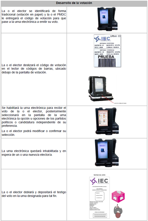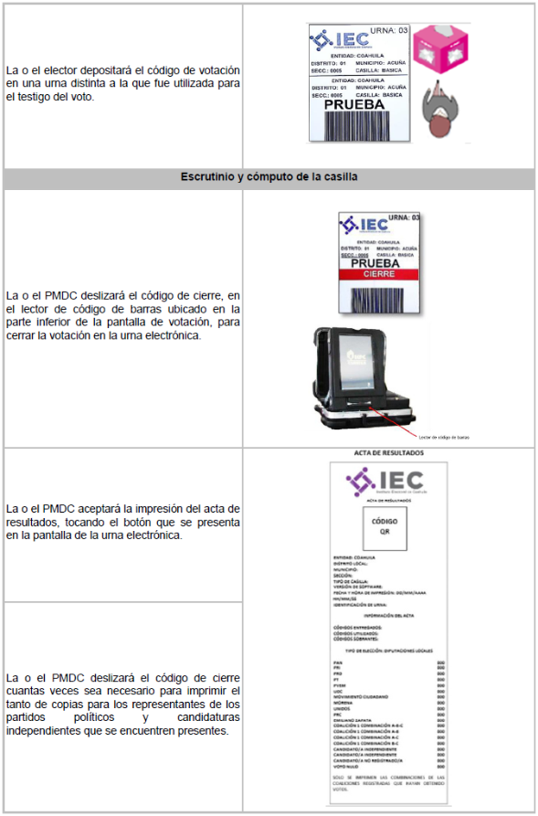 De igual forma se preverá en dicha sesión la realización de una demostración del funcionamiento de las urnas electrónicas que serán utilizadas en la Jornada Electoral y, en el caso de Coahuila, el protocolo para la preparación de los códigos de apertura, votación y cierre que serán entregados al pmdc para la operación de la urna electrónica.
