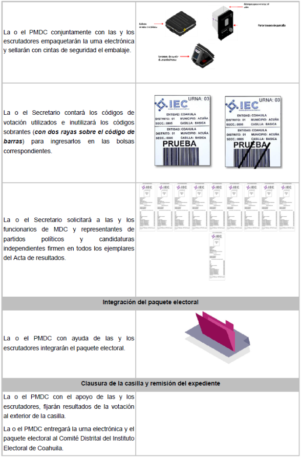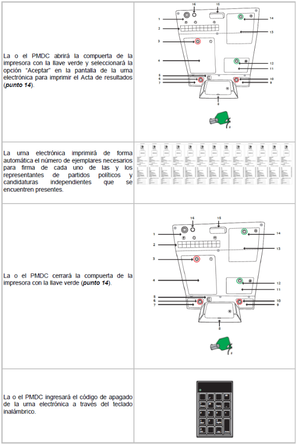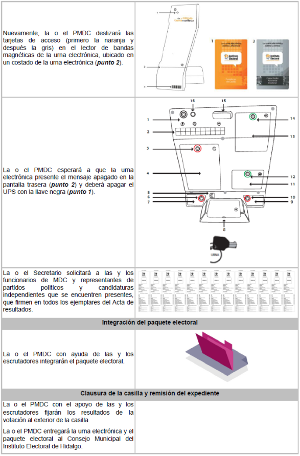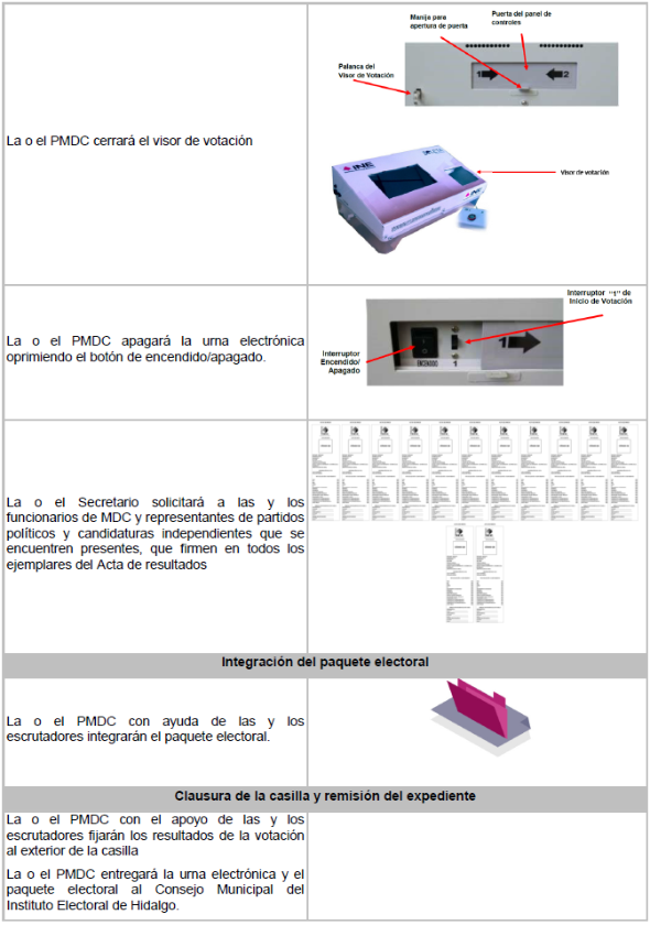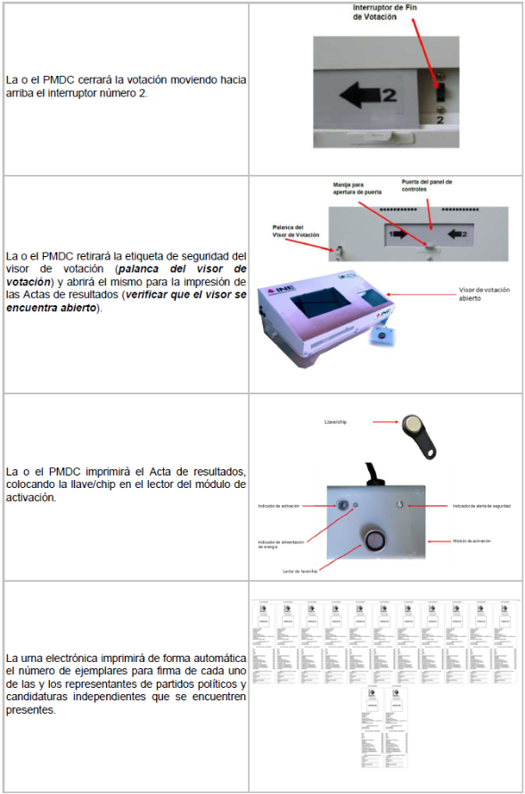 | 35. La o el pmdc deslizará el código de cierre, en el lector de código de barras ubicado en la parte inferior de la pantalla de votación, para cerrar la votación en la urna electrónica. 36. La o el pmdc aceptará la impresión del Acta de resultados, tocando el botón que se presenta en la pantalla de la urna electrónica. 37. La o el pmdc deslizará el código de cierre cuantas veces sea necesario para generar un ejemplar del Acta de resultados para el expediente y para cada uno de las y los representantes de partidos políticos y candidaturas independientes presentes, así como, un ejemplar para el prep y para la bolsa que va por fuera del paquete electoral. 38. La o el pmdc conjuntamente con las y los escrutadores empaquetarán la urna electrónica y sellarán con cintas de seguridad el embalaje. 39. La o el Secretario inutilizará los códigos de votación sobrantes con dos rayas con un plumón indeleble, sobre el código de barras, y sin contarlos, los guardará en la bolsa correspondiente. | 35. La o el pmdc ingresará a través del teclado inalámbrico, el código de cierre. 36. La o el pmdc deslizará las tarjetas de acceso a la urna electrónica en el lector de bandas magnéticas, ubicado en un costado de la urna electrónica para el cierre de la votación. 37. La o el pmdc abrirá la compuerta de la impresora con la llave verde para imprimir el Acta de resultados. 38. La o el pmdc aceptará la impresión del Acta de resultados, tocando el botón que se presenta en la pantalla de la urna electrónica. 39. La urna electrónica imprimirá de forma automática el número de ejemplares del Acta de resultados, para firma de cada uno de las y los representantes de partidos políticos y candidaturas independientes presentes, así como, un ejemplar para el prep y para la bolsa que va por fuera del paquete electoral. | 31. La o el pmdc deslizará la puerta del panel de control hacia la izquierda. 32. La o el pmdc cerrará la votación moviendo hacia arriba el interruptor número 2. 33. La o el pmdc retirará la etiqueta de seguridad del visor de votación. 34. La o el pmdc abrirá el visor de votación para la impresión de las Actas de resultados. 35. La o el pmdc imprimirá el Acta de resultados, colocando la llave/chip en el lector del módulo de activación. 36. La urna electrónica imprimirá de forma automática el número de ejemplares para firma de cada uno de las y los representantes de Partidos políticos y candidaturas independientes presentes, así como, un ejemplar para el prep y para la bolsa que va por fuera del paquete electoral. |