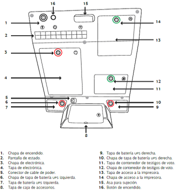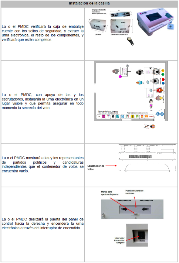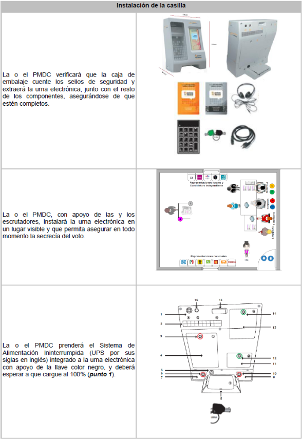 | 3. La o el pmdc con ayuda de las y los escrutadores abrirá la caja y extraerá la urna electrónica, el resto de los componentes, y verificará que estén completos. Esta actividad deberá llevarse a cabo en presencia de las y los representantes de los partidos políticos y candidaturas independientes. 4. La o el pmdc con ayuda de las y los escrutadores armarán la urna en que se depositarán los testigos de voto y mostrarán a las y los funcionarios y representantes de los Partidos políticos y candidaturas independientes que se encuentra vacía. 5. La o el Secretario contará el número de códigos de votación recibidos; incluyendo el de las y los representantes de Partidos políticos y candidaturas independientes, y quedará asentado en el acta de la jornada electoral. 6. La o el pmdc, con apoyo de las y los escrutadores, instalarán la urna electrónica en un lugar visible y que permita asegurar en todo momento la secrecía del voto véase el esquema número 3, de la sección 1.4.3. 7. Una vez instalada la urna electrónica, la o el pmdc abrirá el compartimiento de acceso al botón de encendido, ubicado en la parte superior de la urna electrónica con ayuda de la llave que le fue proporcionada. | 3. La o el pmdc con ayuda de las y los escrutadores abrirá la caja y extraerá la urna electrónica, el resto de los componentes y verificará que estén completos. Esta actividad deberá llevarse a cabo en presencia de las y los representantes de los partidos políticos y candidaturas independientes. 4. La o el pmdc, con apoyo de las y los escrutadores, instalará la urna electrónica en un lugar visible y que permita asegurar la secrecía del voto. Deberá cuidarse que en todo momento la o el pmdc pueda observar la parte posterior de la urna electrónica véase el esquema número 1, de la sección 1.4.3. 5. La o el pmdc mostrará a las y los representantes de Partidos políticos y candidaturas independientes que el contenedor de votos se encuentra vacío. 6. La o el pmdc prenderá el Sistema de Alimentación Ininterrumpida (UPS por su sigla en inglés) integrado a la urna electrónica con apoyo de la llave color negro, y deberá esperar a que cargue al 100%. 7. La o el pmdc encenderá la urna electrónica oprimiendo el botón de inicio, ubicado en la parte posterior. | 3. La o el pmdc con ayuda de las y los escrutadores abrirá la caja y extraerá la urna electrónica, el resto de los componentes y verificará que estén completos. Esta actividad deberá llevarse a cabo en presencia de las y los representantes de los partidos políticos y candidaturas independientes. 4. La o el pmdc, con apoyo de las y los escrutadores, instalará la urna electrónica en un lugar visible y que permita asegurar en todo momento la secrecía del voto véase el esquema número 2, de la sección 1.4.3. 5. La o el pmdc mostrará a las y los representantes de Partidos políticos y candidaturas independientes que el contenedor de votos se encuentra vacío. 6. La o el pmdc deslizará la puerta del panel de control hacia la derecha y encenderá la urna electrónica a través del interruptor de encendido. 7. La o el pmdc abrirá el visor de votación para la impresión de las Actas de inicio. |