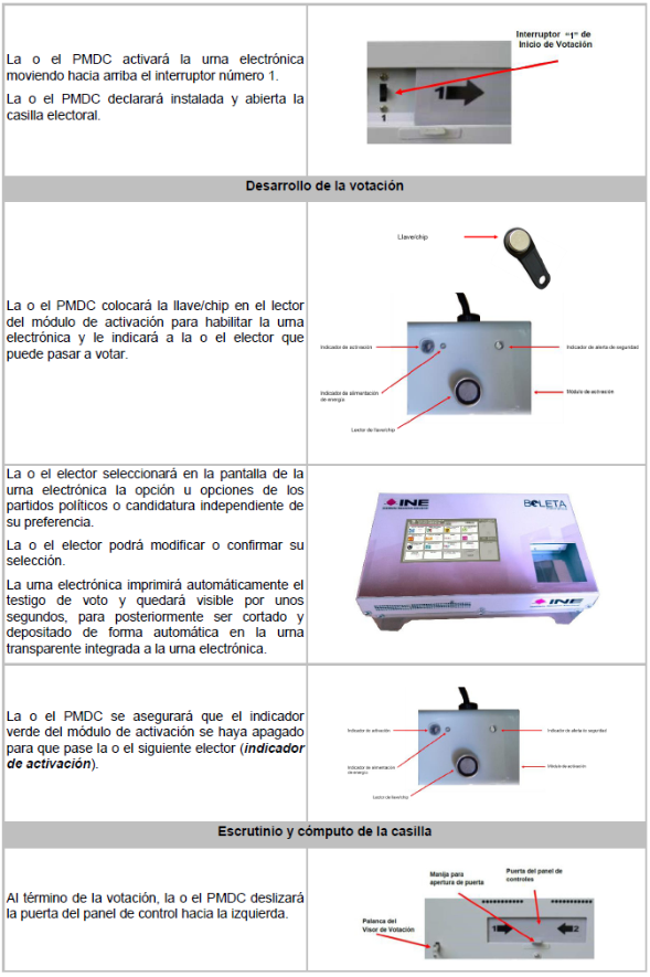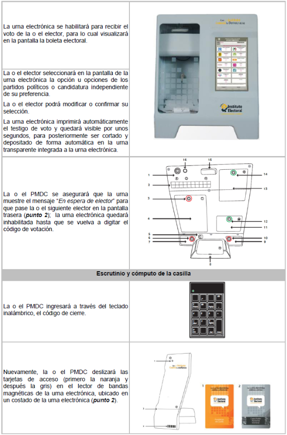 | 16. La o el elector entregará a la o el pmdc su credencial para votar. 17. La o el pmdc identificará a la o el elector por medio de su credencial para votar. 18. La o el Secretario localizará el nombre de la o el elector en la Lista Nominal de Electores. 19. La o el pmdc entregará el código de votación a la o el elector para que pase a la urna electrónica a emitir su voto. 20. La o el elector deslizará el código de votación en el lector de códigos de barras, ubicado debajo de la pantalla de votación. 21. La urna electrónica se habilitará para recibir el voto de la o el elector, mediante la cual visualizará en la pantalla la boleta electoral electrónica. 22. La o el elector seleccionará en la pantalla de la urna electrónica la opción u opciones de los partidos políticos o candidatura independiente de su preferencia. 23. La o el elector podrá modificar o confirmar su selección. | 20. La o el elector entregará a la o el pmdc su credencial para votar. 21. La o el pmdc identificará a la o el elector por medio de su credencial para votar. 22. La o el Secretario localizará el nombre de la o el elector en la Lista Nominal de Electores. 23. La o el pmdc digitará el código de votación a través del teclado inalámbrico para habilitar la urna electrónica y le indicará a la o el elector que puede pasar a votar. 24. La urna electrónica se habilitará para recibir el voto de la o el elector, para lo cual visualizará en la pantalla la boleta electoral electrónica. 25. La o el elector seleccionará en la pantalla de la urna electrónica la opción u opciones de los partidos políticos o candidatura independiente de su preferencia. 26. La o el elector podrá modificar o confirmar su selección. | 16. La o el elector entregará a la o el pmdc su credencial para votar. 17. La o el pmdc identificará a la o el elector por medio de su credencial para votar. 18. La o el Secretario localizará el nombre de la o el elector en la Lista Nominal de Electores. 19. La o el pmdc colocará la llave/chip en el lector del módulo de activación para habilitar la urna electrónica y le indicará a la o el elector que puede pasar a votar. 20. La urna electrónica se habilitará para recibir el voto de la o el elector, para lo cual visualizará en la pantalla la boleta electoral electrónica. 21. La o el elector seleccionará en la pantalla de la urna electrónica la opción u opciones de los partidos políticos o candidatura independiente de su preferencia. |