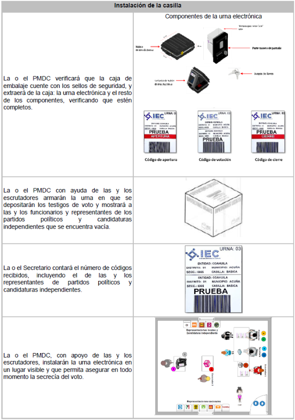 a) Instalación de las casillas. Las y los funcionarios de las Mesas Directivas de Casillas deberán realizar la instalación de la urna electrónica, así como el armado de canceles electorales y urnas respectivas;