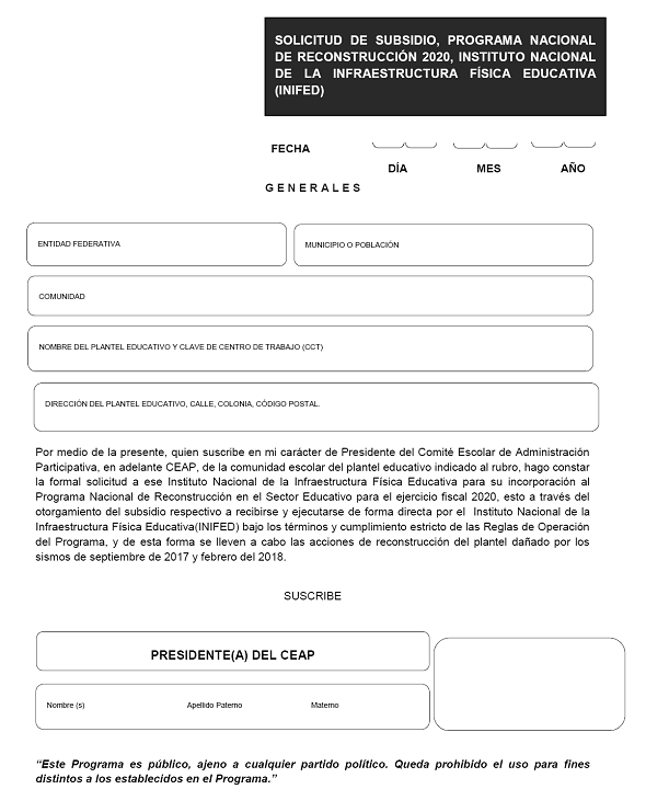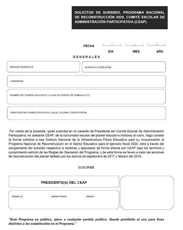 Solicitud de Subsidio: Documento inicial mediante el cual la comunidad educativa por conducto del comité constituido en cada plantel educativo, solicita recursos federales para ser aplicados en la acción al plantel educativo elegible, para que sea beneficiado por el Programa.
