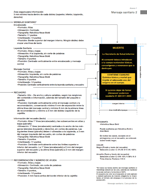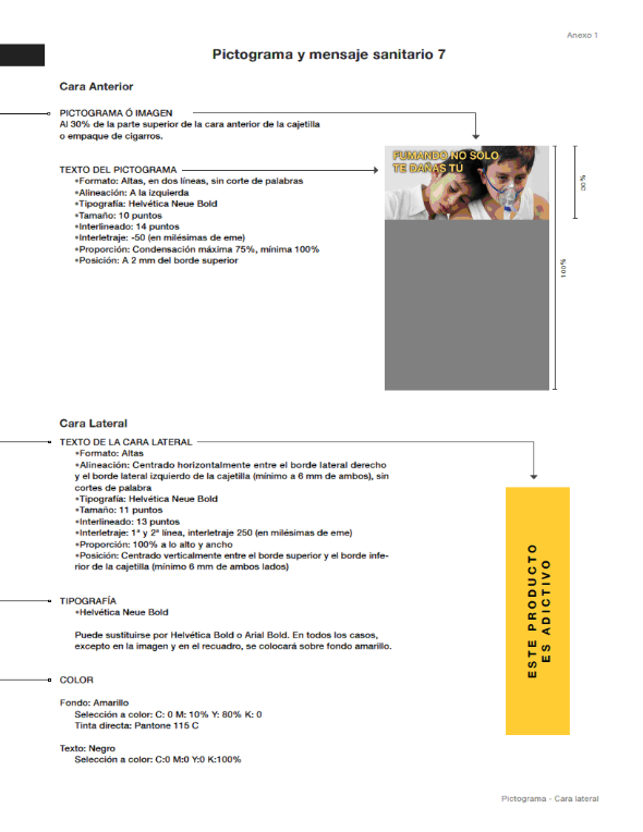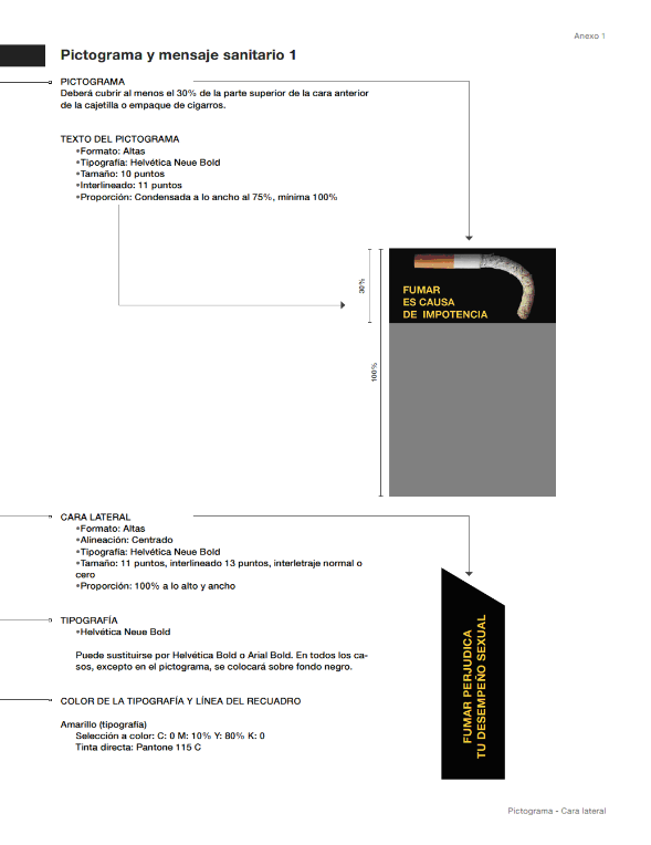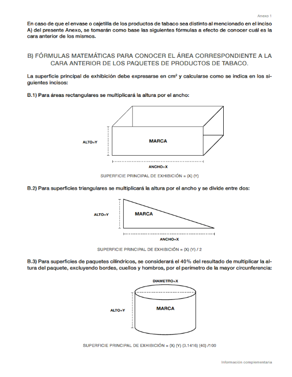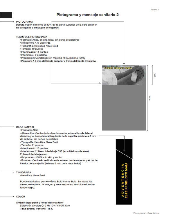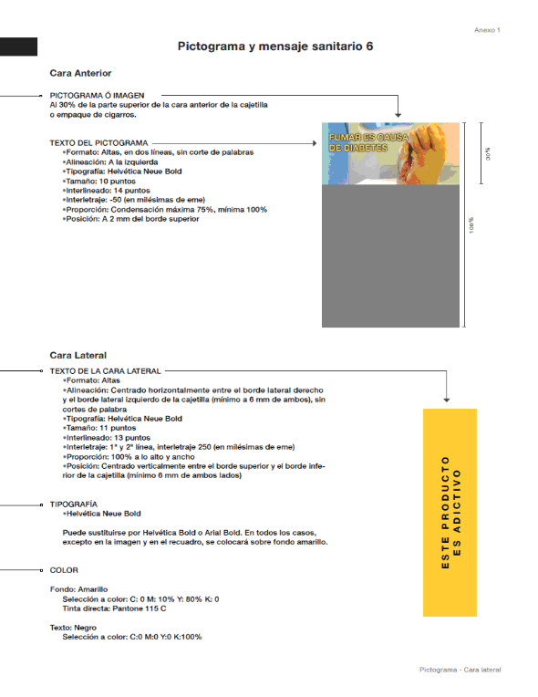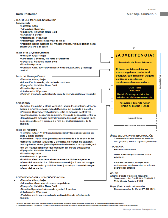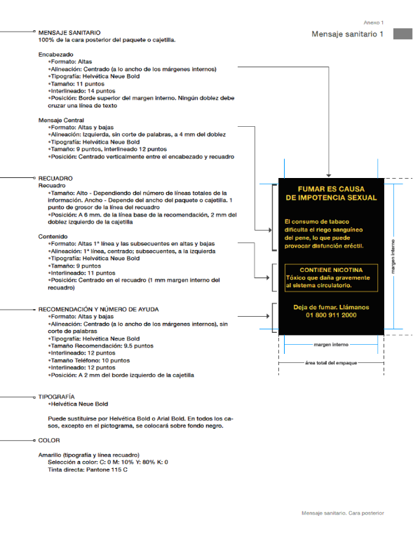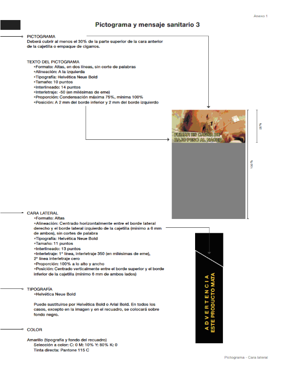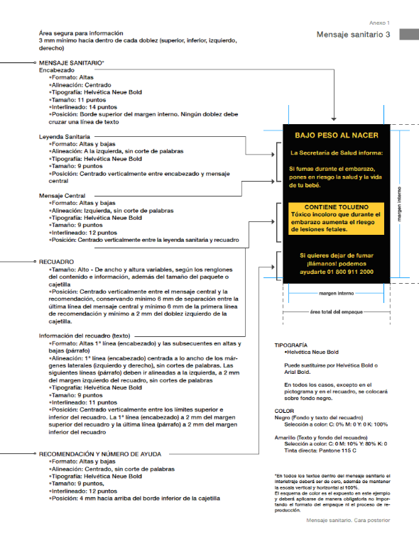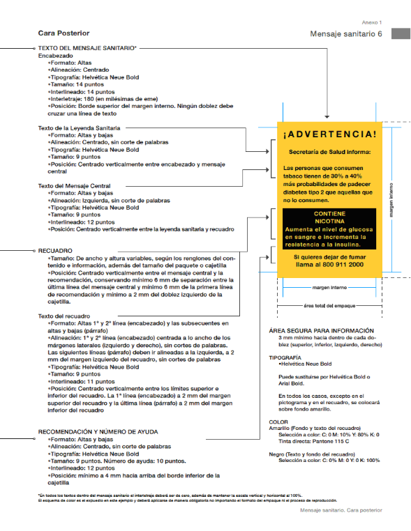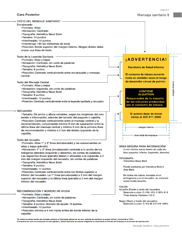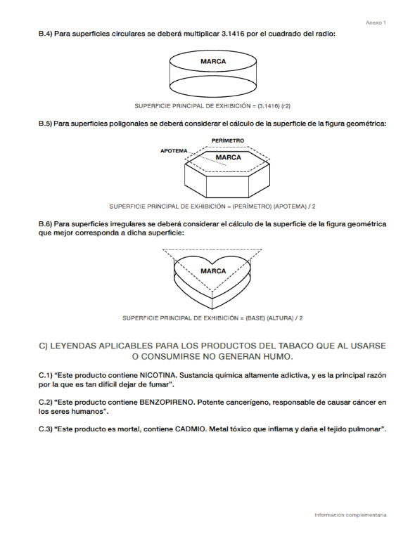 TERCERO. Los productos de tabaco que al usarse o consumirse no generen humo, además de lo señalado en el Acuerdo mediante el cual se dan a conocer las disposiciones para la formulación, aprobación, aplicación, utilización e incorporación de las leyendas, imágenes, pictogramas, mensajes sanitarios e información que deberá figurar en todos los paquetes de productos del tabaco y en todo empaquetado y etiquetado externo de los mismos, publicado en el Diario Oficial de la Federación el 24 de diciembre de 2009 y su modificatorio publicado en el citado órgano de difusión oficial el 9 de mayo de 2011, deberán incluir en el 100% de la superficie de una de las caras laterales de todos los paquetes que se hayan producido, fabricado o importado y que sean distribuidos dentro del territorio nacional, las leyendas previstas en el inciso C del Anexo 1 del presente Acuerdo.