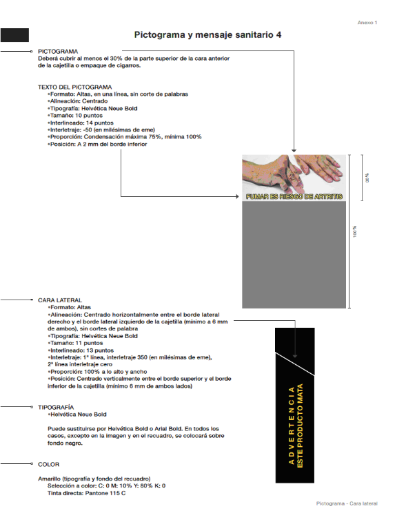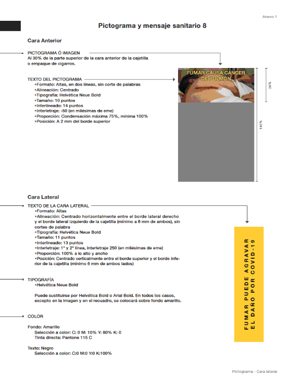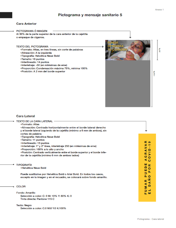 a. Los pictogramas y mensajes sanitarios 1, 2, 3 y 4 del Anexo 1 del presente Acuerdo, deberán figurar en todos los paquetes de productos del tabaco y en todo empaquetado y etiquetado externo de los mismos, que se fabriquen o produzcan en territorio nacional, o bien que se importen a éste, a partir de la entrada en vigor del presente Acuerdo y hasta el 30 de noviembre de 2020.