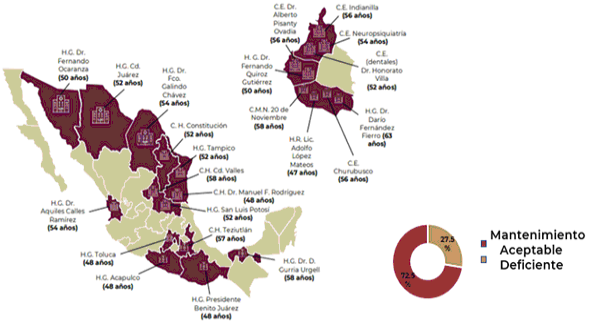 | Método de cálculo | Porcentaje de unidades médicas del primer y segundo nivel de atención, que cuentan con Programas de Conservación y mantenimiento al periodo = (Total de unidades médicas del primer y segundo nivel de atención que cuentan con Programas de conservación y mantenimiento al periodo / Total de unidades médicas del primer y segundo nivel de atención al periodo) * 100 | ||||||||