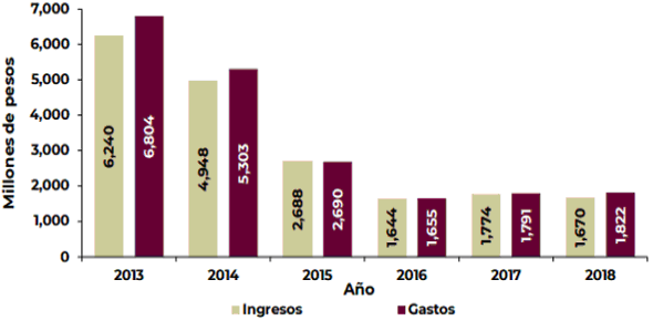 | Observaciones | Se consideran millones de pesos corrientes. Por déficit se entiende el resultado de restar a los ingresos los gastos y costos sin reservas. El valor del denominador puede sufrir cambios durante el sexenio | ||||||||