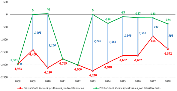 | Sustitución en método de cálculo del indicador | Razón del déficit con respecto al ingreso en el fondo de los Servicios Sociales y Culturales = -1,373/6,362 | ||||||||