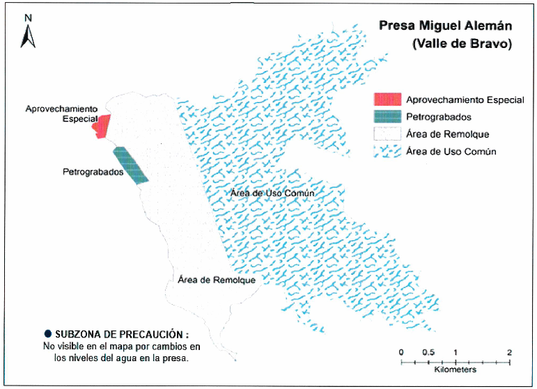 5. Subzona de Uso Público Petrograbados.- Abarca una superficie de 18.393788 hectáreas integradas por un polígono en donde existen yacimientos arqueológicos con petrograbados, en el cual se permiten actividades de turismo náutico, uso de vehículos náuticos sin propulsión mecánica, uso turístico de baja velocidad en las diferentes modalidades de remo, velero y paseo en la presa, así como el uso turístico de alta velocidad en las diferentes modalidades de esquí en los horarios que establezca la Capitanía.