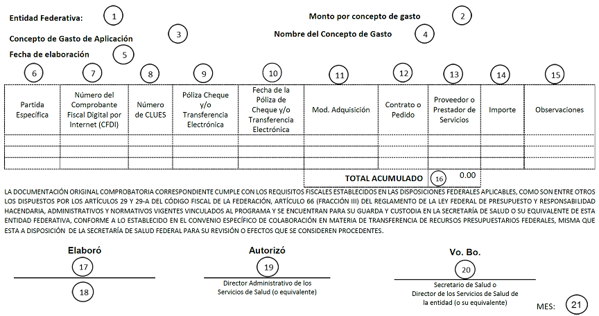 | Capítulo de gasto | Presupuesto autorizado | Presupuesto modificado | Presupuesto ejercido (comprobado) | Presupuesto comprometido (con documentación soporte) | Reintegro TESOFE (1) | | No. Cuenta | Rendimientos generados | Rendimientos ejercidos | Rendimientos reintegrados a TESOFE (2) |