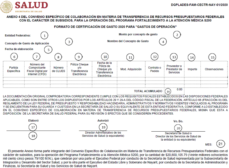| 9 | Póliza Cheque y/o Transferencia Electrónica del pago efectuado | | 20 | Secretario de Salud o Director de los Servicios de Salud de la entidad (o su equivalente). |